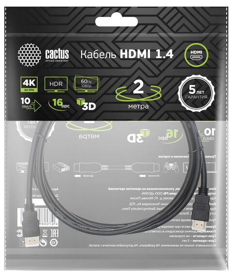 Описание Cactus HDMI (m)/HDMI (m) 2м. [CS-HDMI.1.4-2]
