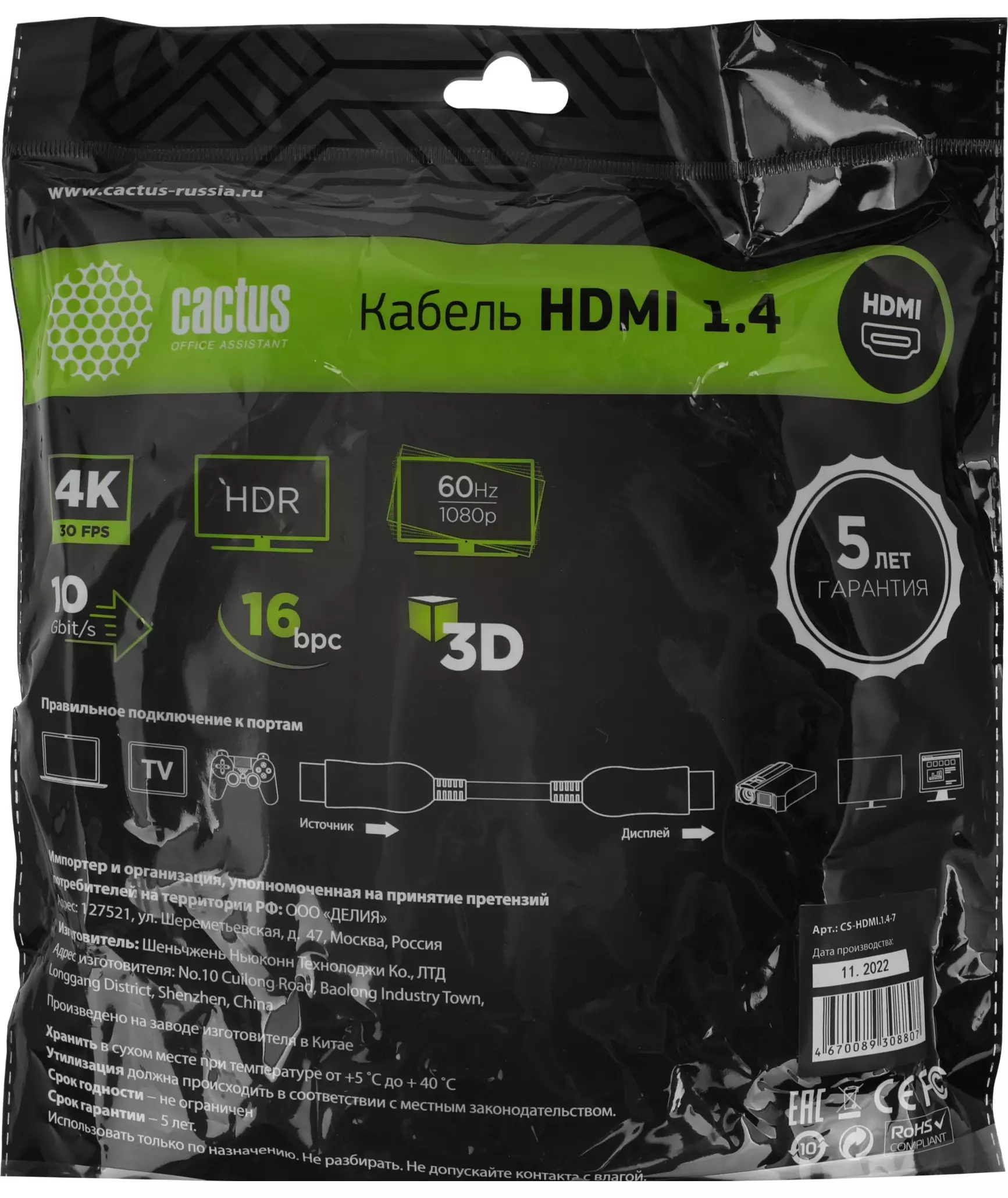 Описание Cactus HDMI (m)/HDMI (m) 7м. [CS-HDMI.1.4-7]