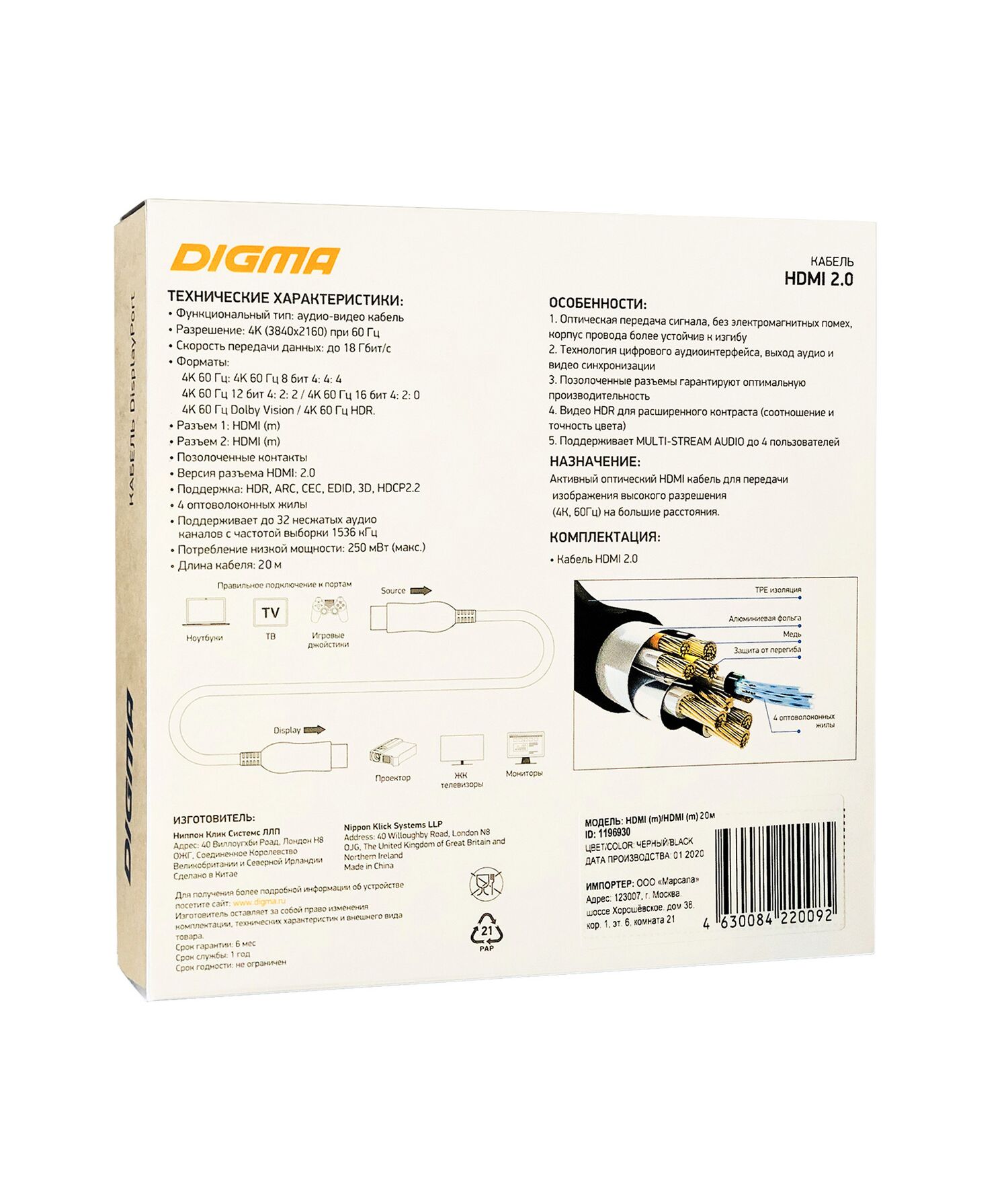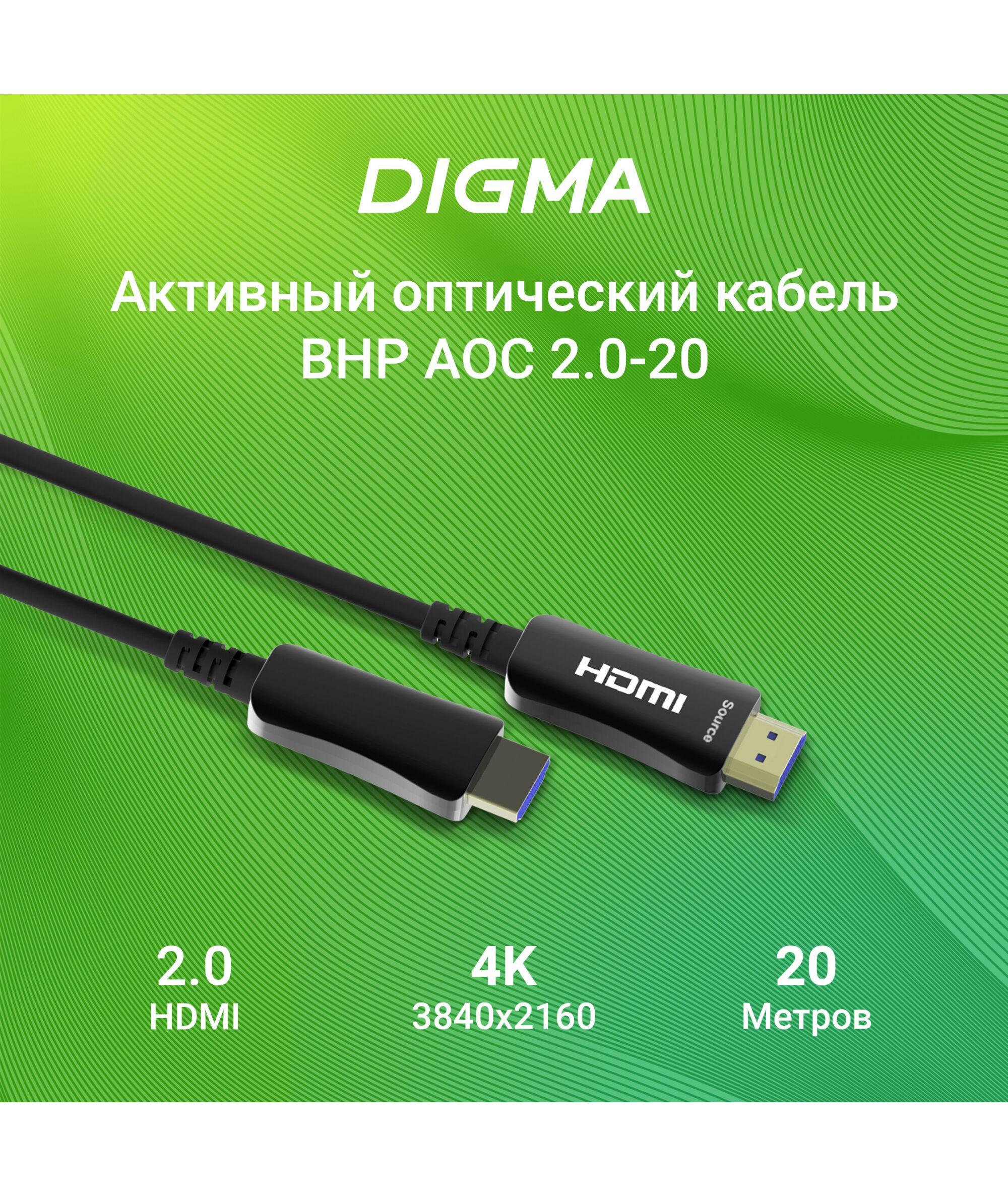 Кабель аудио-видео Digma BHP AOC 2.0-20 HDMI 2.0 AOC HDMI (m)/HDMI (m) 20м. позолоч.конт. черный