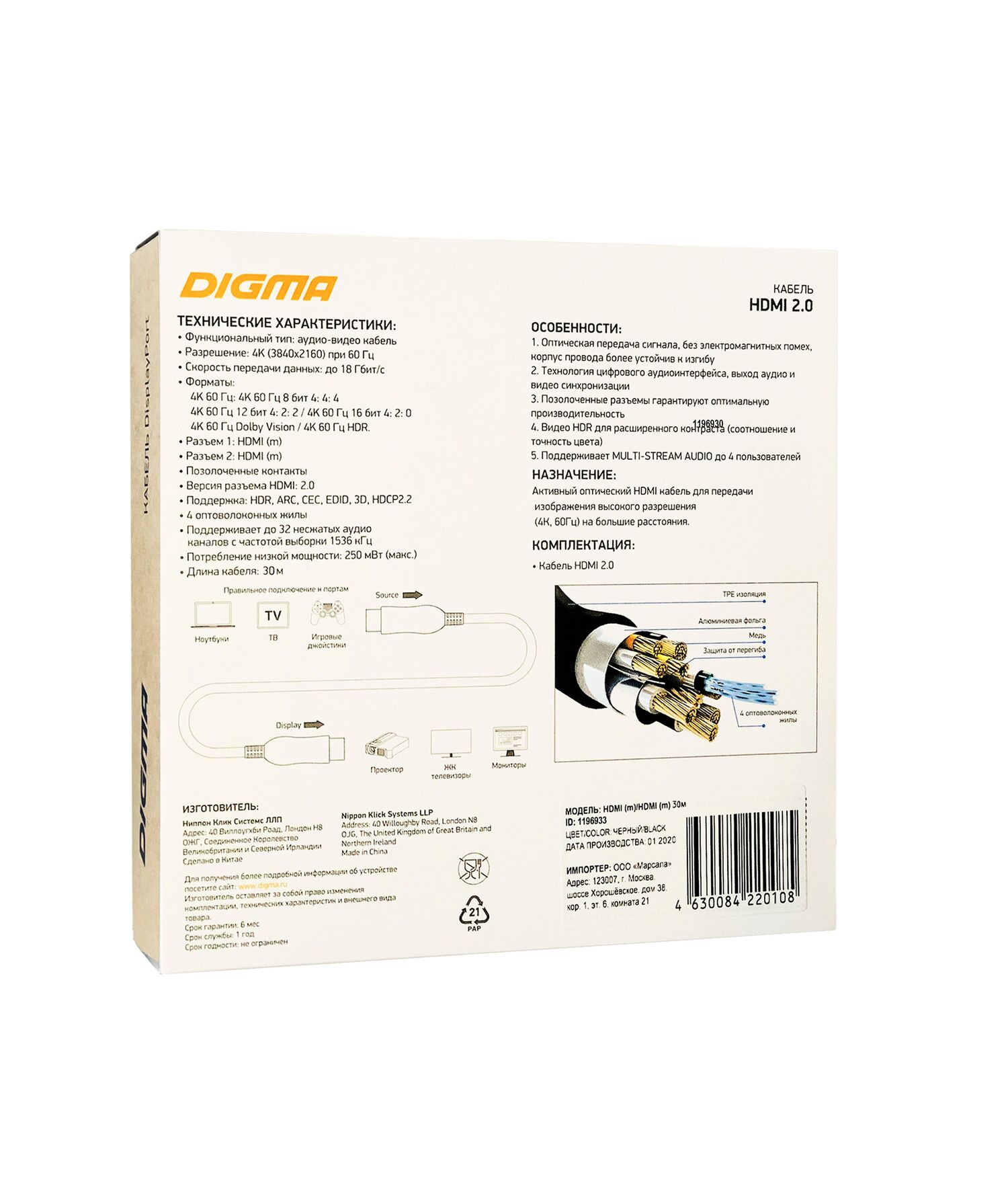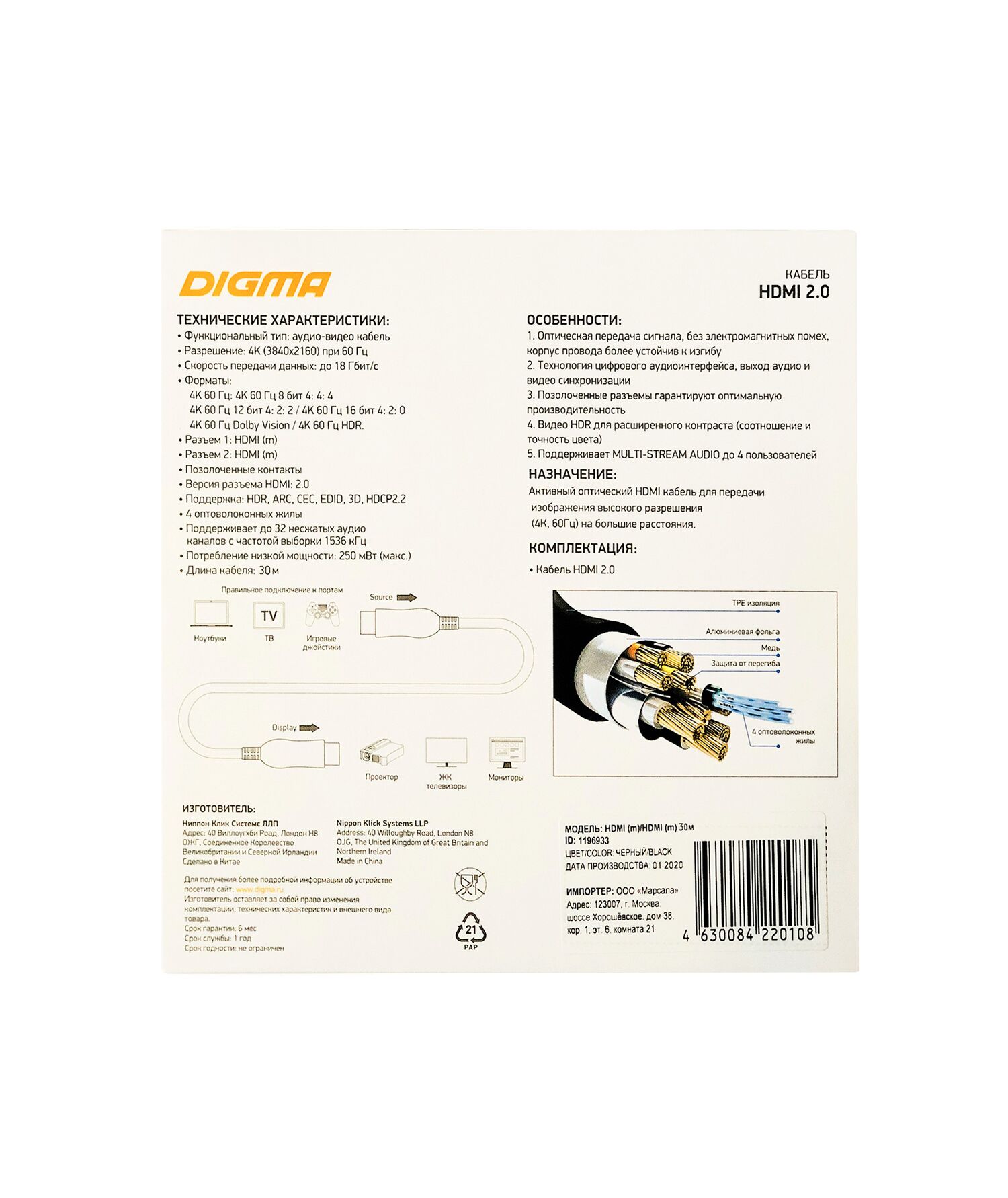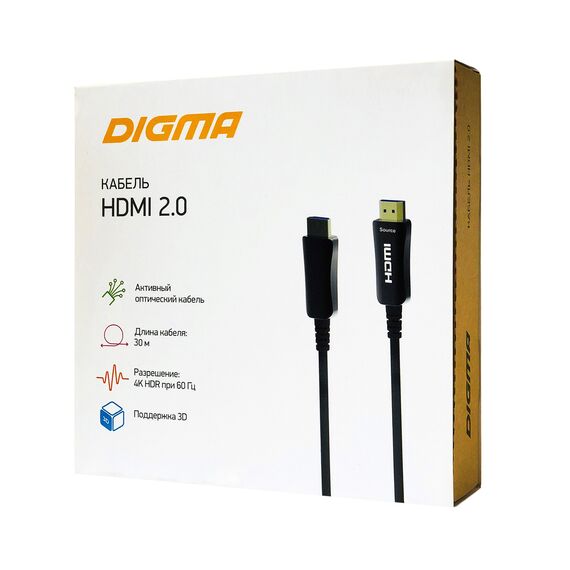 Кабель аудио-видео Digma BHP AOC 2.0-30 HDMI 2.0 AOC HDMI (m)/HDMI (m) 30м. позолоч.конт. черный