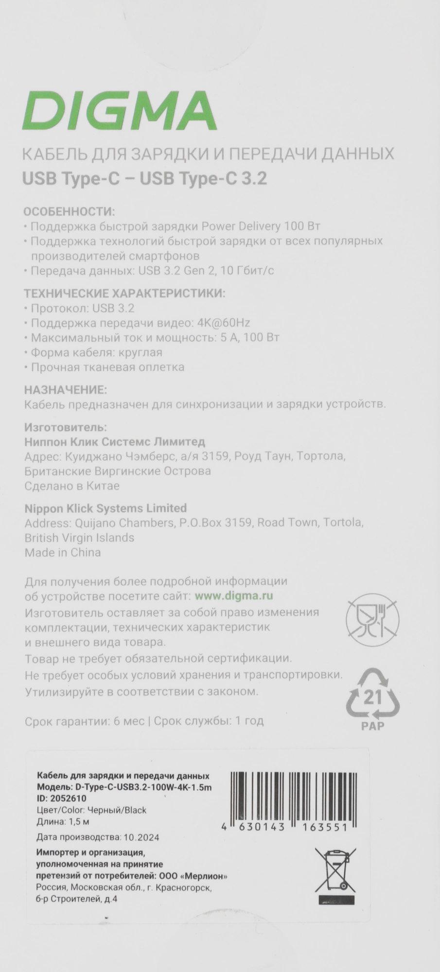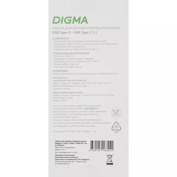 Описание Digma D-TYPE-C-USB3.2-100W-4K-1.5M
