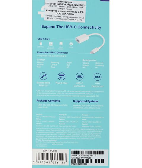 Переходник TP-Link UC400 USB Type-C (m) USB 3.0 A(f) 0.1м белый