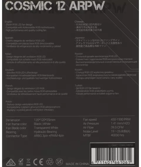 Вентилятор для корпуса Formula COSMIC 12WH ARPW 120х120x25 белый 4-pin 26.8дБ RTL