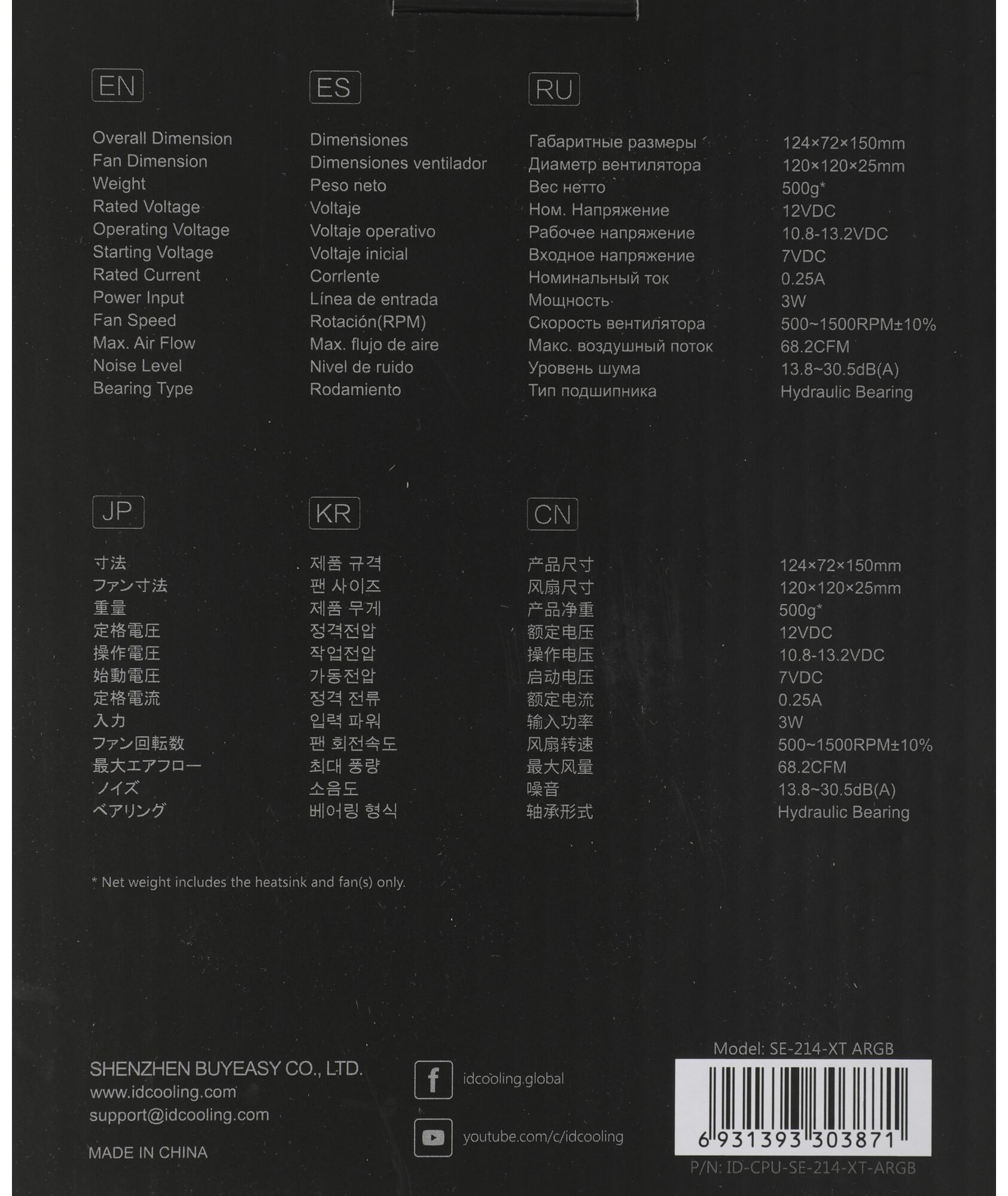 Устройство охлаждения(кулер) ID-Cooling SE-214-XT ARGB Soc-AM5/AM4/1200/1700/1851 черный 4-pin 16-29dB Al+Cu 180W 810gr RTL
