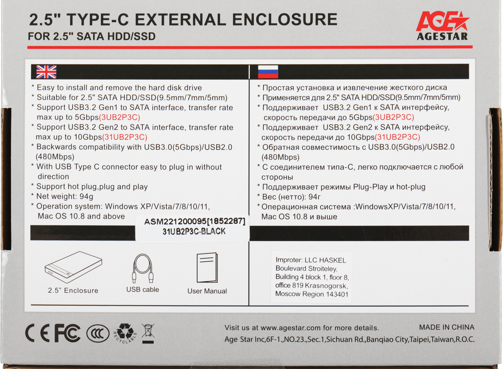 Внешний корпус для HDD/SSD AgeStar 31UB2P3C SATA USB3.2 пластик черный hotswap 2.5"
