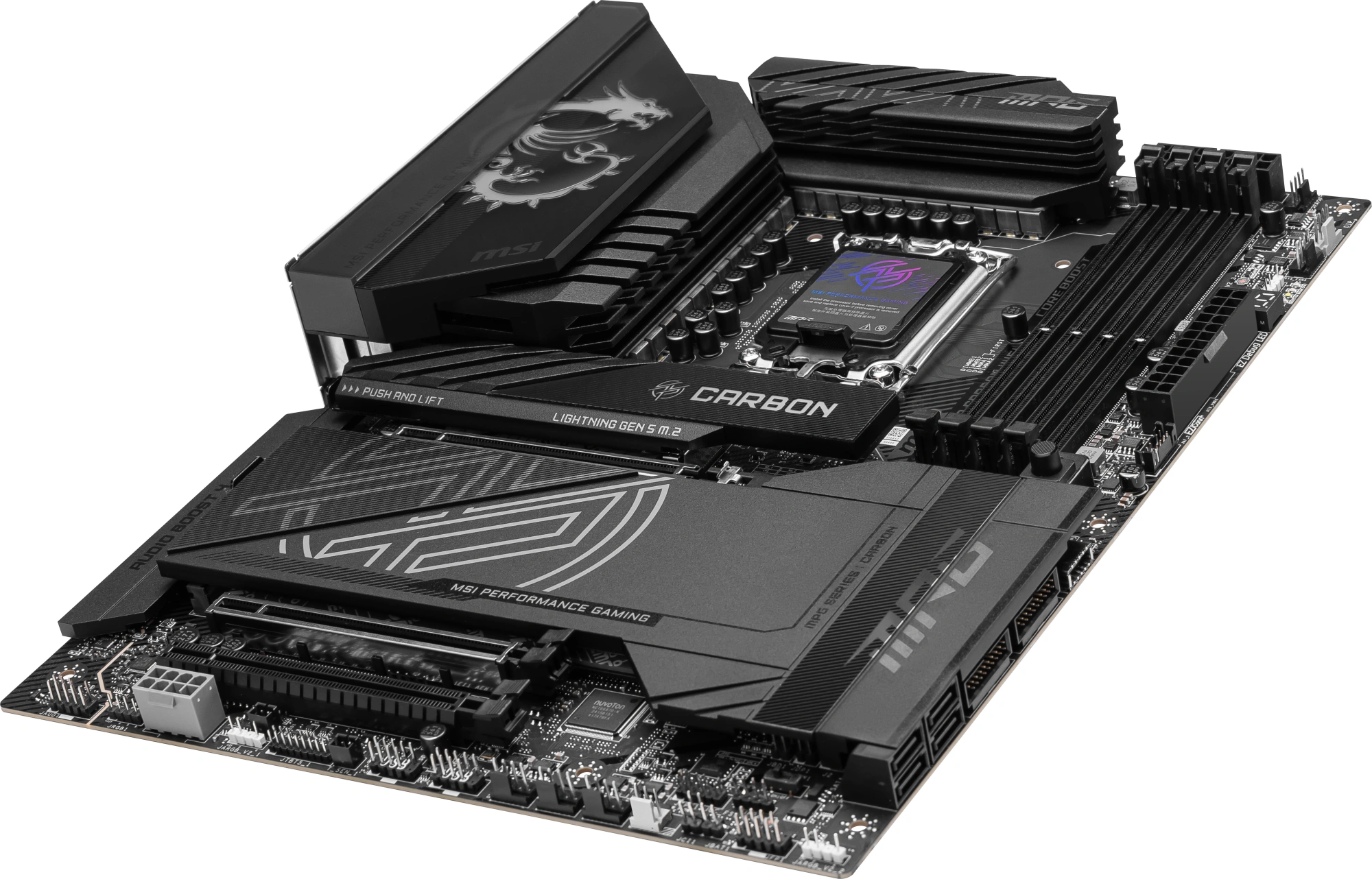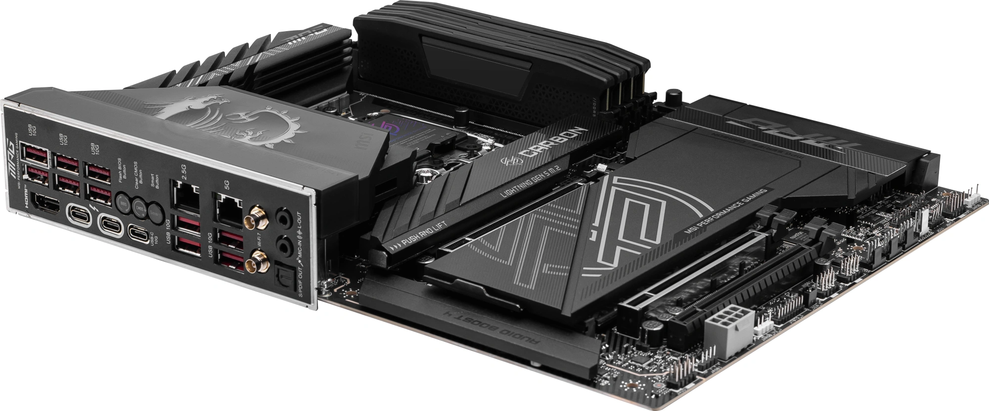 Материнская плата MSI MPG Z890 CARBON WIFI Soc-1851 Intel Z890 4xDDR5 ATX AC`97 8ch(7.1) 5Gigabit + 2.5Gigabit Ethernet RAID+HDMI