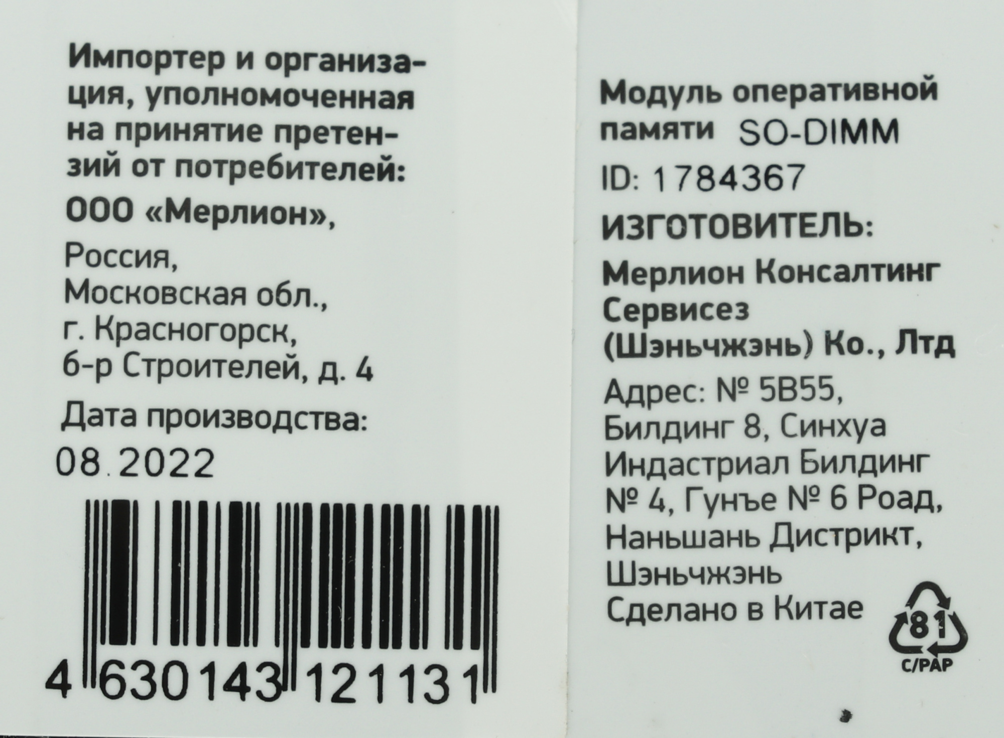 Модуль памяти Digma 8Gb DDR4 3200MHz PC4-25600 CL22 SODIMM 260-pin 1.2В RTL [DGMAS43200008S]