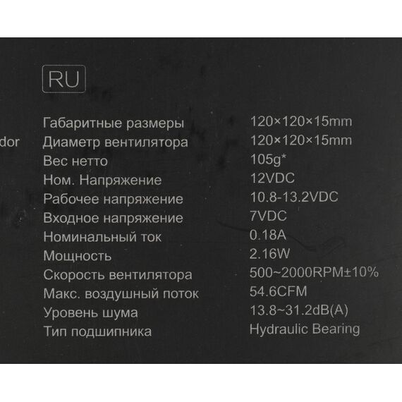 | Потребляемая мощность вентилятора | 2.16 Вт |