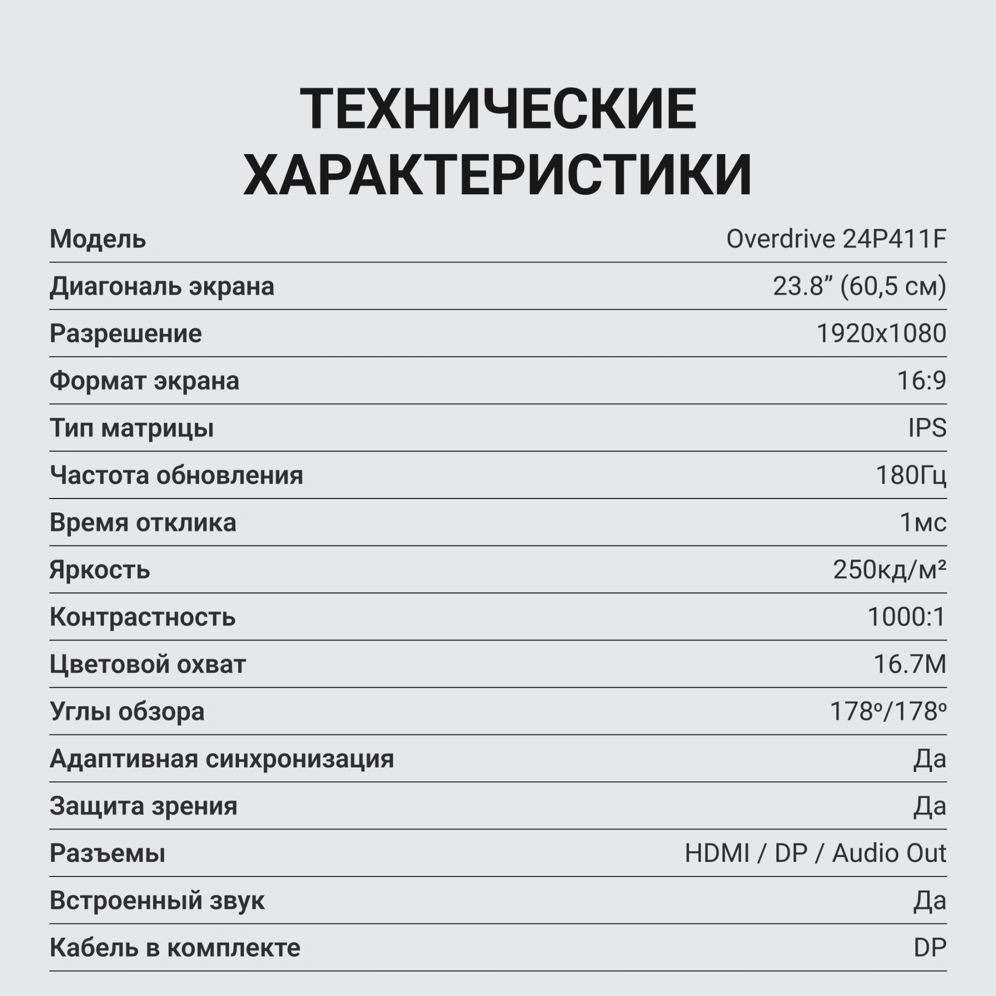 | Комплектация | кабель DP, инструкция пользователя, гарантийный талон |