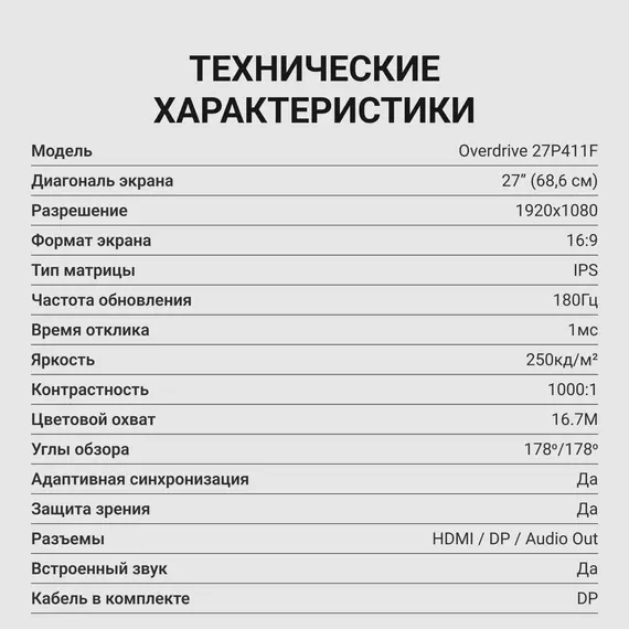 | Комплектация | кабель DP, инструкция пользователя, гарантийный талон |
