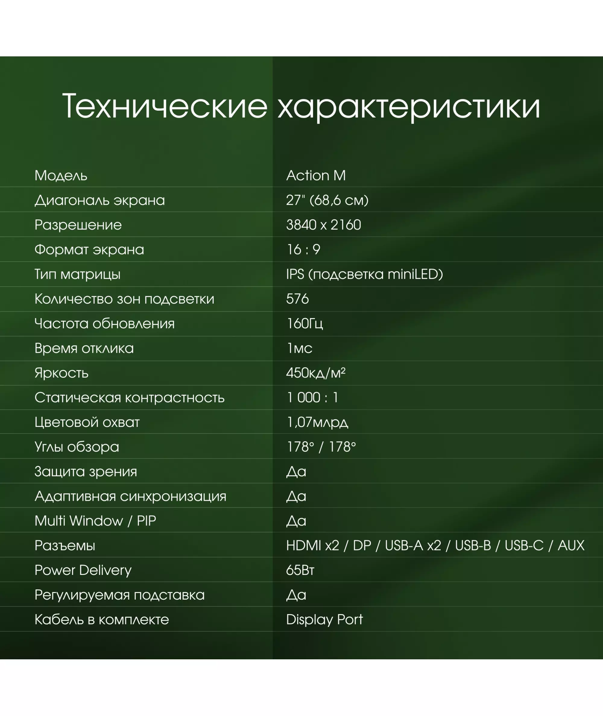 | Комплектация | кабель DP, инструкция пользователя, гарантийный талон |