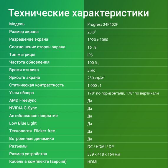 Энергосбережение: Монитор Progress 24P402F потребляет всего 0.5 Вт в режиме ожидания, что делает его дружелюбным к окружающей среде.