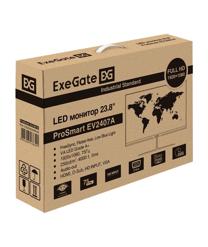 Монитор безрамочный Exegate ProSmart EV2407A 23.8" VA LED, FHD, 1920x1080@75Гц, 16:9, 280cd/m2, 3000:1, 178°/178°, 5ms, Speakers, D-Sub, HDMI2.0 [EX294344RUS]