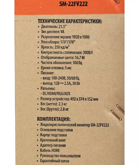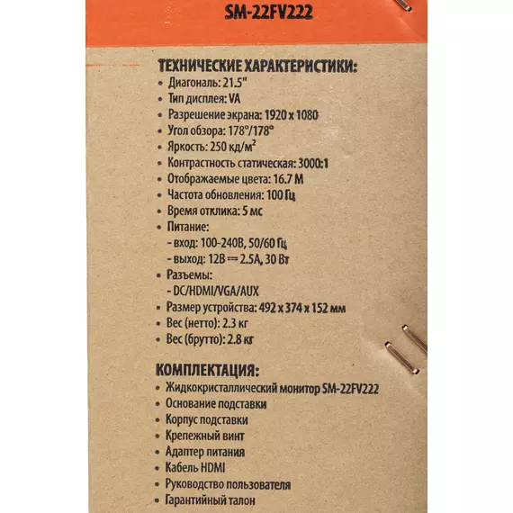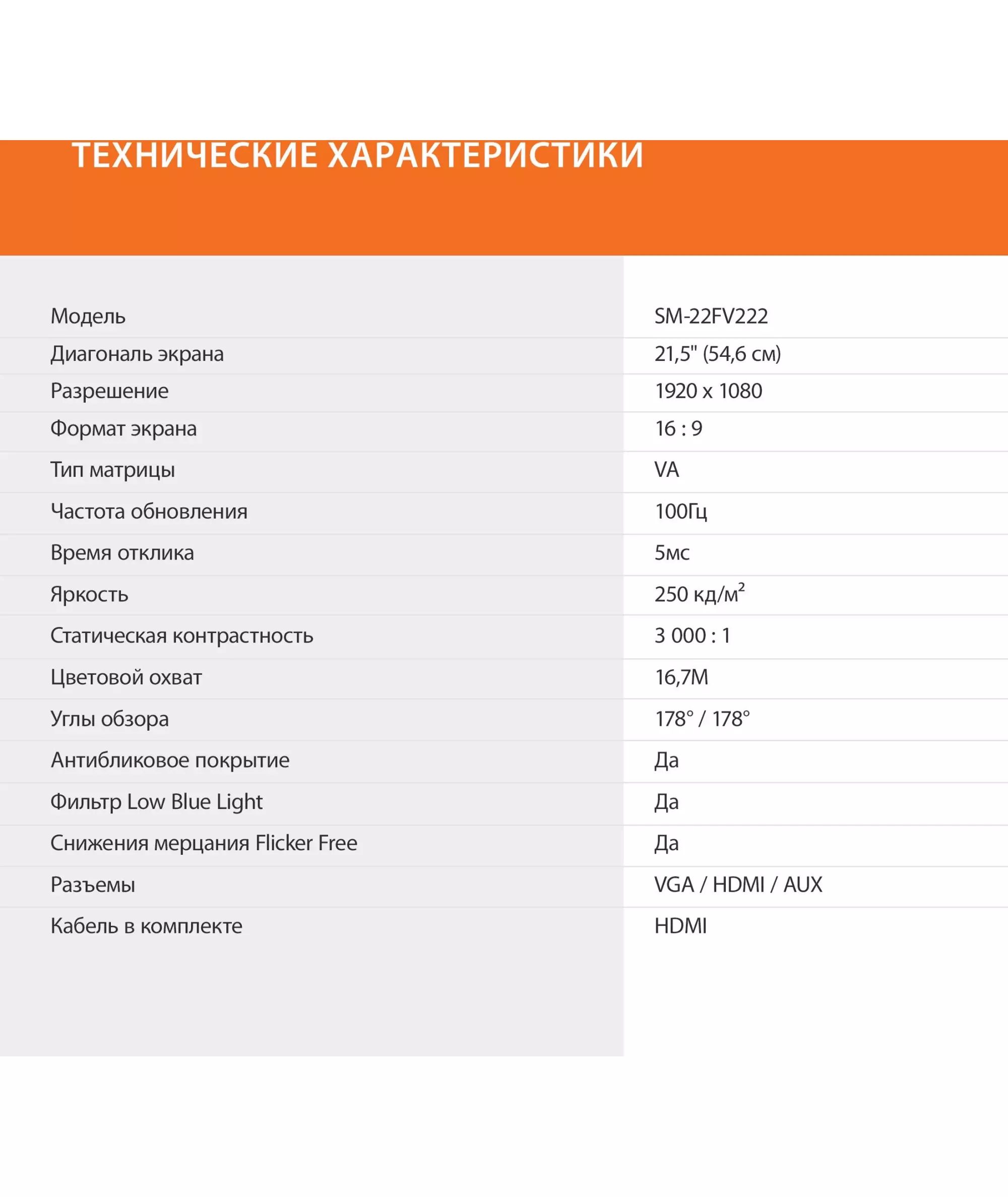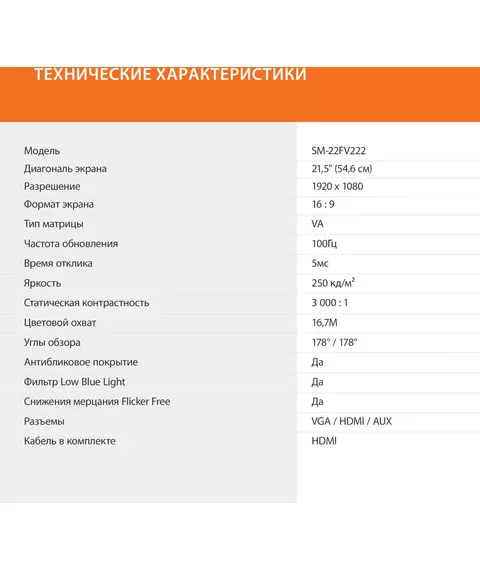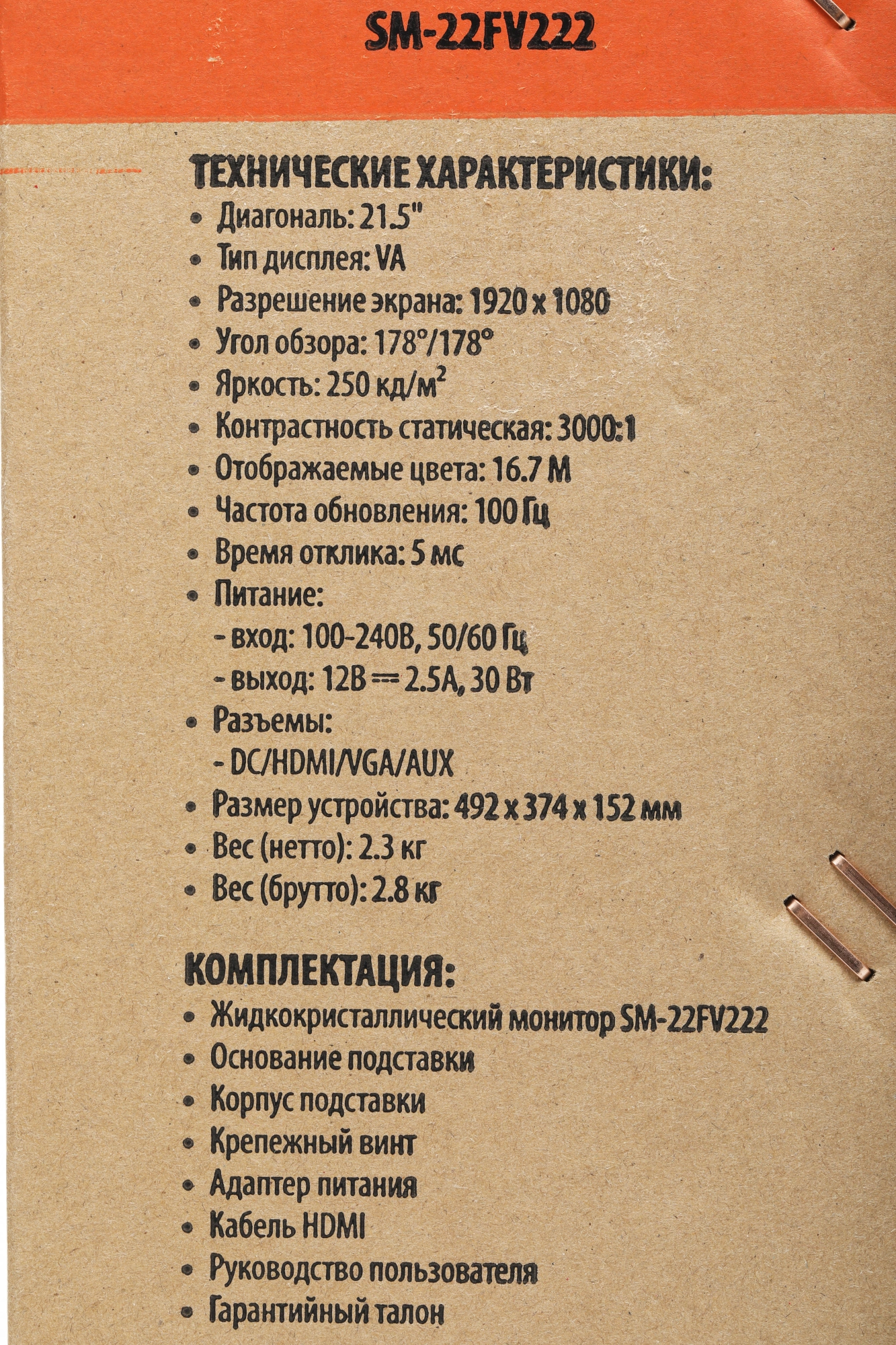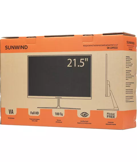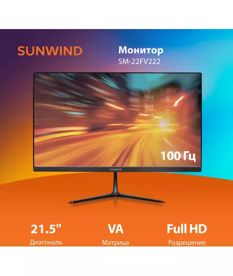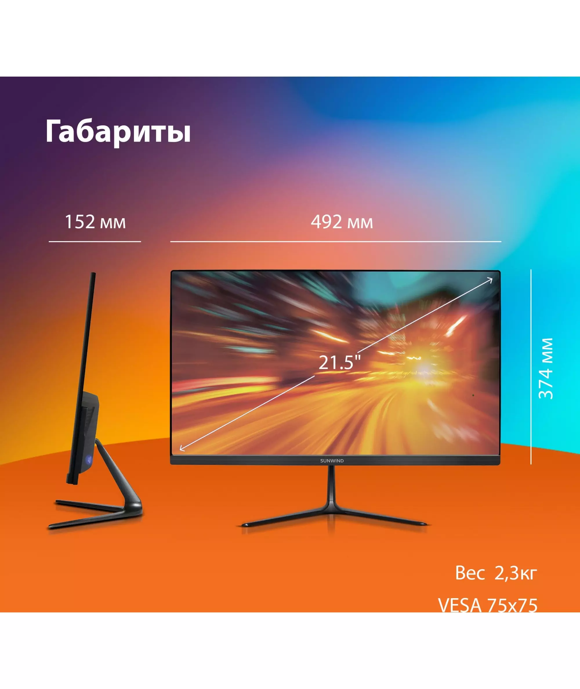 Монитор SunWind SM-22FV222 21.5" черный VA 5ms 16:9 HDMI матовая 250cd 178гр/178гр 1920x1080 100Hz FreeSync VGA FHD 2.29кг