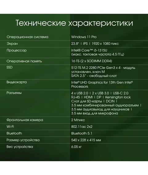 | Процессор | Intel Core i3 1315U 1.2ГГц |