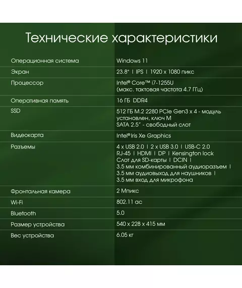 | Комплектация | Моноблок, адаптер питания, клавиатура, мышь, гарантия |