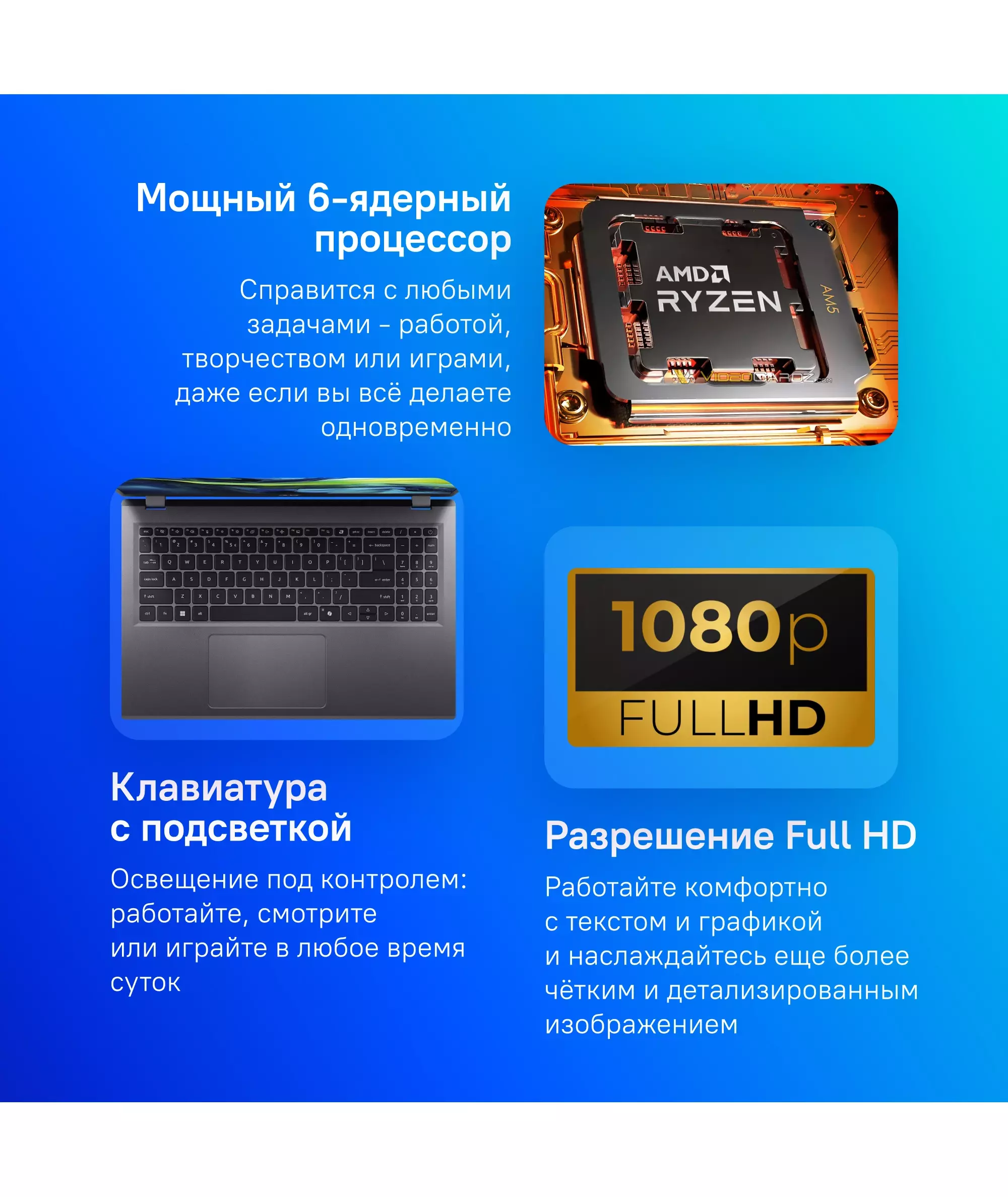 Ноутбук Acer Aspire 15 A15-41M-R1HS Ryzen 5 8640HS 16Gb SSD1Tb AMD Radeon 760M 15.6" IPS FHD (1920x1080) без ОС metall WiFi BT Cam [NX.KXACD.003]