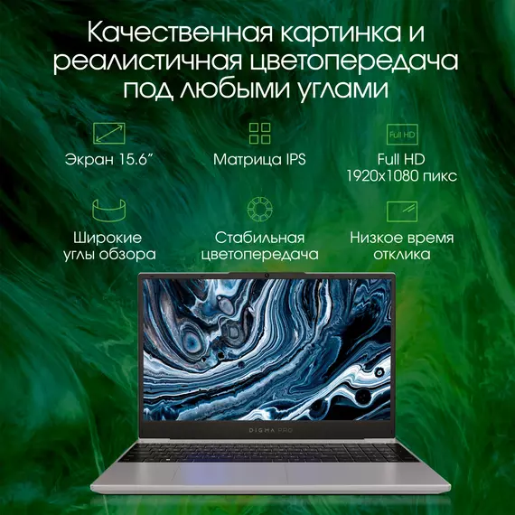 Ноутбук Digma Pro Breve создаст комфортные условия для работы с документами, обработки фото и видео, администрирования сайтов и других задач. Картинка на IPS FHD дисплее диагональю 15,6" всегда остается яркой, насыщенной и четкой благодаря широким углам обзора и быстрому отклику. Символы клавиатуры с регулируемой подсветкой отчетливо видны даже в темноте.