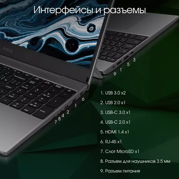 Разъемы 3xUSB-A и 2xUSB-C позволят подключить к ноутбуку флешки, смартфоны, мышь и прочую проводную периферию. Через порт HDMI можно транслировать видеосигнал на внешний монитор, телевизор или проектор.