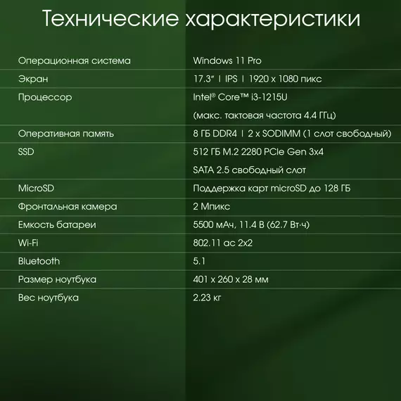 | Процессор | Intel Core i3 1215U 1.2ГГц |