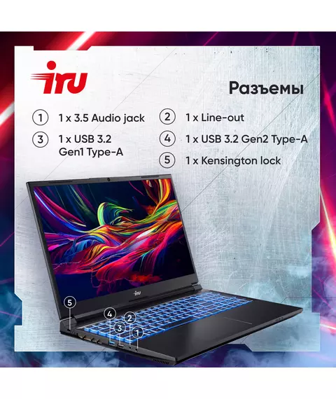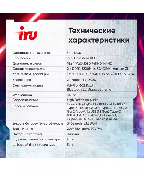 Ноутбук iRU Калибр 15ALC Core i5 12500H 16Gb SSD512Gb NVIDIA GeForce RTX 3060 6Gb 15.6" IPS FHD (1920x1080) без ОС black WiFi BT Cam 3465mAh [1930301]