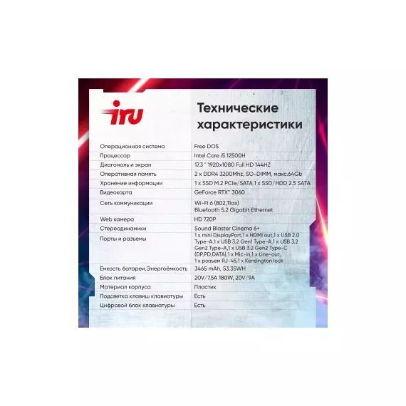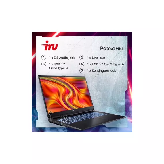 Ноутбук iRU Калибр 17ALC Core i5 12500H 16Gb SSD512Gb NVIDIA GeForce RTX 3060 6Gb 17.3" IPS FHD (1920x1080) без ОС black WiFi BT Cam 3465mAh [1911325]