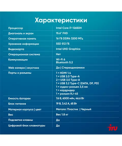 Ноутбук iRU Strato 15ALI Core i7 12650H 16Gb SSD512Gb Intel UHD Graphics 15.6" IPS FHD (1920x1080) FreeDOS black WiFi BT Cam 6000mAh [2084776]