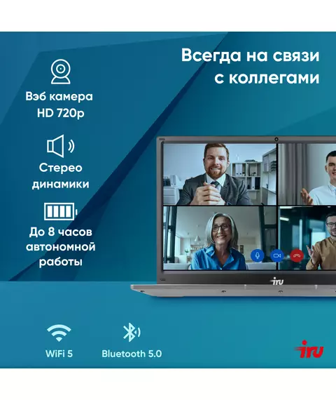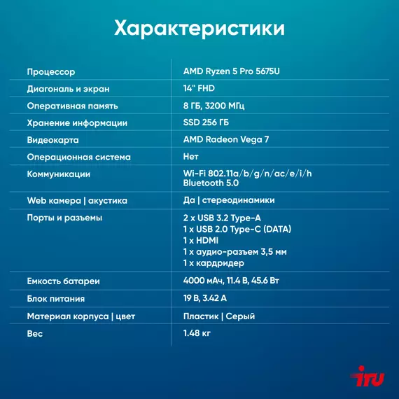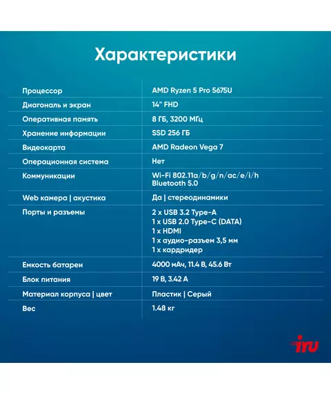 Ноутбук iRU Tactio 14RLH Ryzen 5 Pro 5675U 8Gb SSD256Gb AMD Radeon Rx Vega 7 14" IPS FHD (1920x1080) Free DOS grey WiFi BT Cam 4000mAh [2058867]