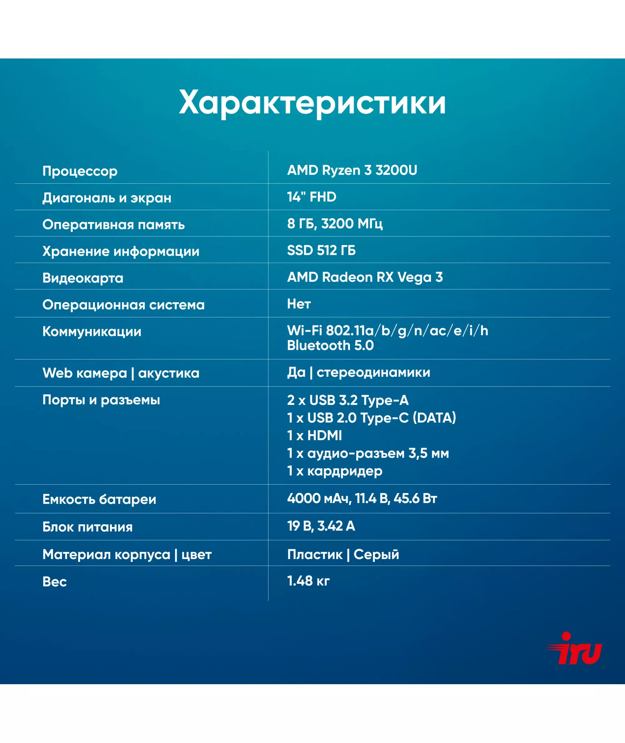 Ноутбук iRU Tactio 14RLH Ryzen 3 3200U 8Gb SSD512Gb AMD Radeon 14" IPS FHD (1920x1080) Free DOS grey 4000mAh [2058880]