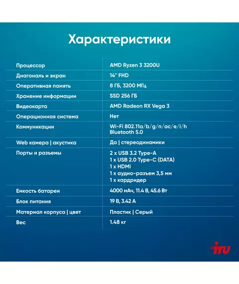 Ноутбук iRU Tactio 14RLH Ryzen 3 3200U 8Gb SSD256Gb AMD Radeon Rx Vega 3 14" IPS FHD (1920x1080) Free DOS grey WiFi BT Cam 4000mAh [2058883]