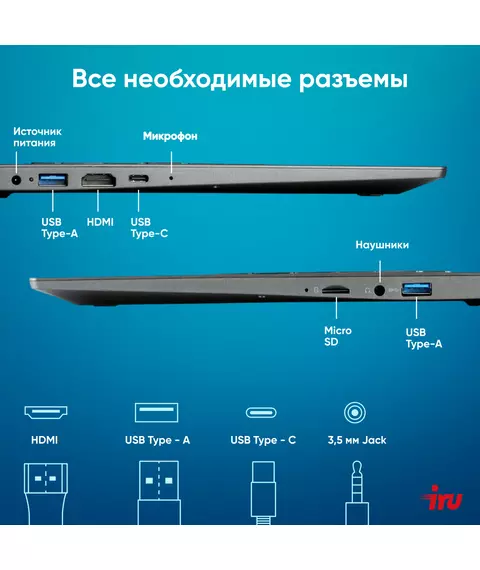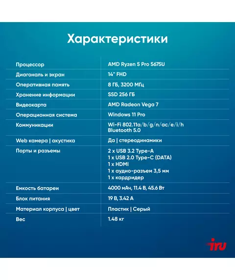 Ноутбук iRU Tactio 14RLH Ryzen 5 Pro 5675U 8Gb SSD256Gb AMD Radeon Graphics AMD Graphics 14" IPS FHD (1920x1080) Windows 11 Pro Multi Language 64 grey WiFi BT Cam 4000mAh [2059083]