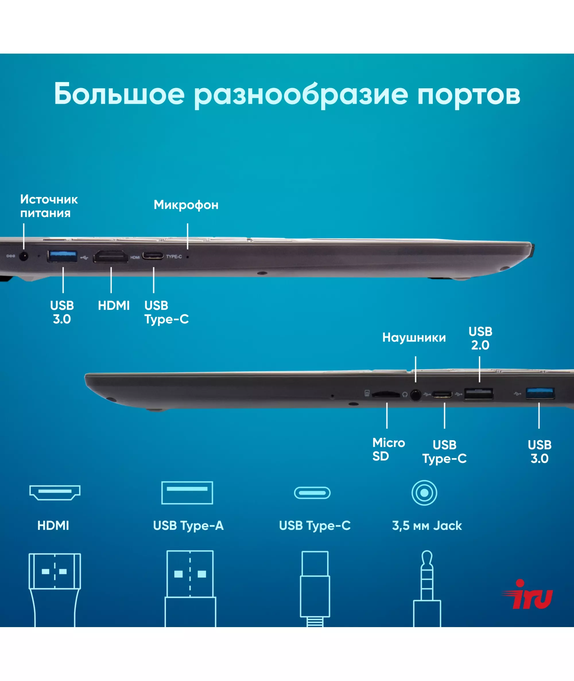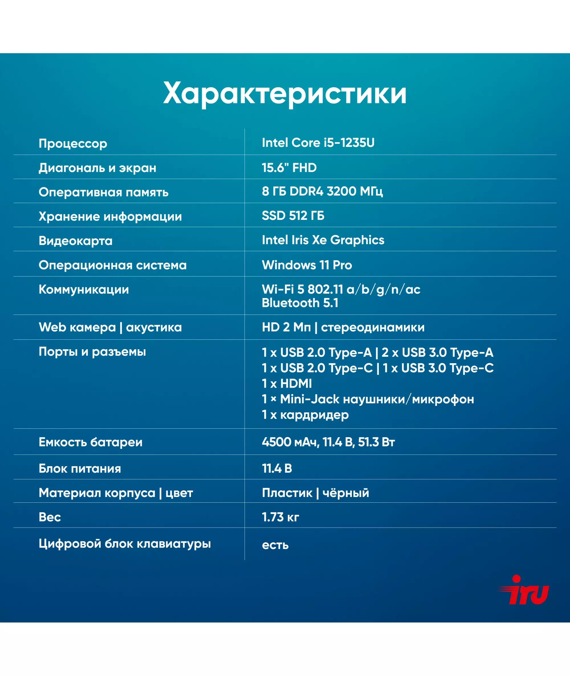 Ноутбук iRU Tactio 15ALG Core i5 1235U 8Gb SSD512Gb Intel Iris Xe graphics 15.6" IPS FHD (1920x1080) Windows 11 Professional 64 black WiFi BT Cam 4500mAh [2019270]
