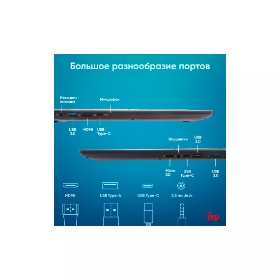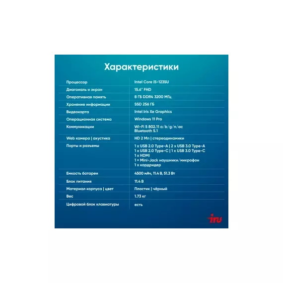 Ноутбук iRU Tactio 15ALG Core i5 1235U 8Gb SSD256Gb Intel Iris Xe graphics 15.6" IPS FHD Windows 11 Pro black WiFi BT Cam [2044618]