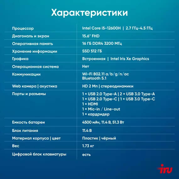 Ноутбук iRU Tactio 15ALG Core i5 12600H 16Gb SSD512Gb Intel Iris Xe graphics 15.6" IPS FHD (1920x1080) без ОС black WiFi BT Cam 4500mAh [2126364]