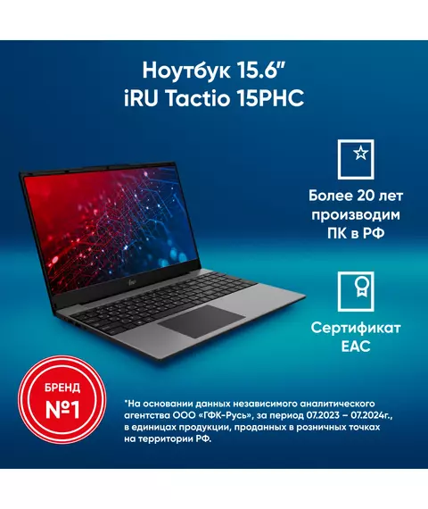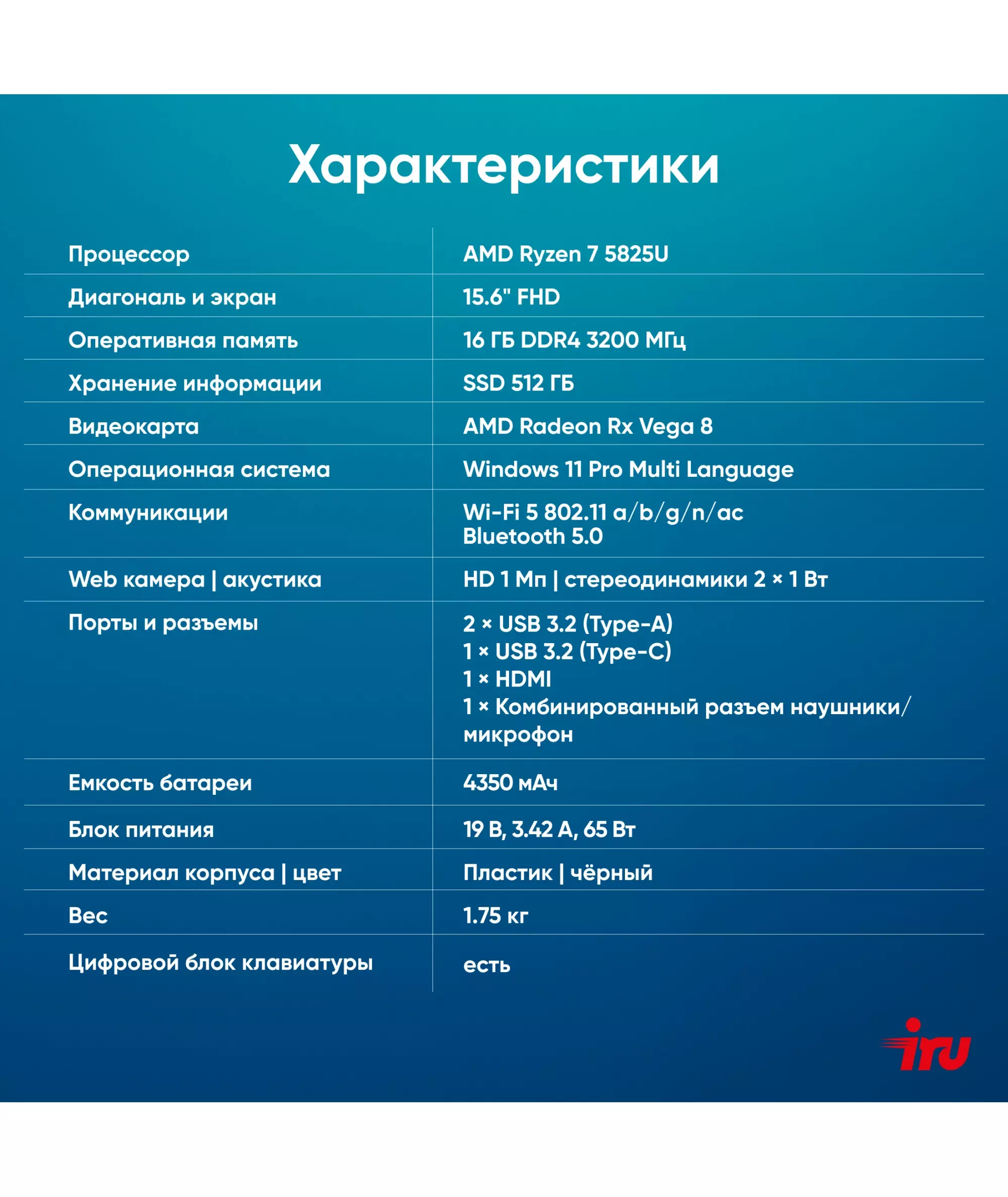 Ноутбук iRU Tactio 15PHC Ryzen 7 5825U 16Gb SSD512Gb AMD Radeon Graphics 15.6" IPS FHD (1920x1080) Windows 11 Pro Multi Language black WiFi BT Cam 4350mAh [2046017]