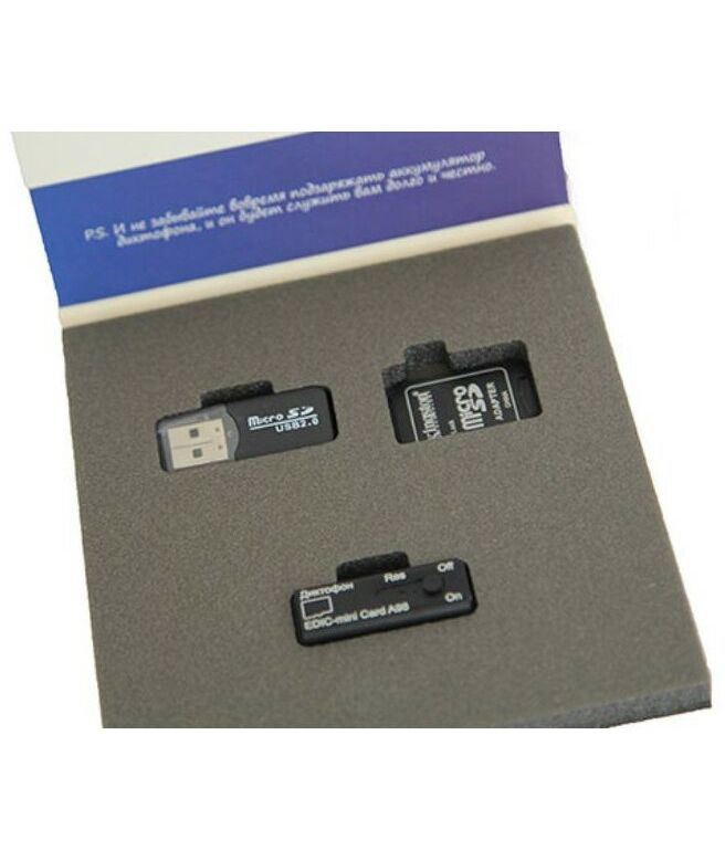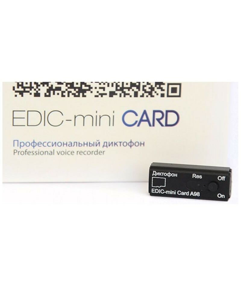 - EDIC-mini СARD A98 — профессиональный цифровой диктофон , самый миниатюрный среди диктофонов серии CARD и CARD16 (всего 37 x 15 x 11мм), а его вес составляет всего 7 грамм. Несмотря на размеры, диктофон является профессиональным звукозаписывающим устройством и предназначен для проведения высококачественной аудиозаписи в течении длительного времени