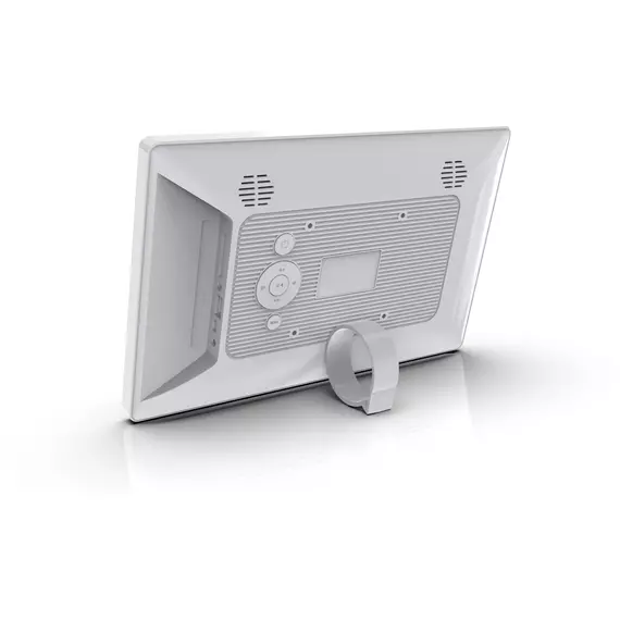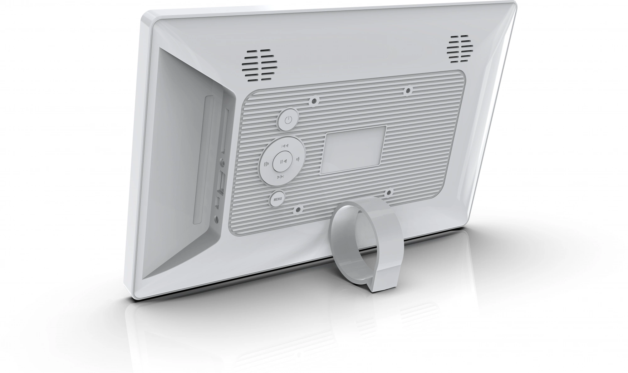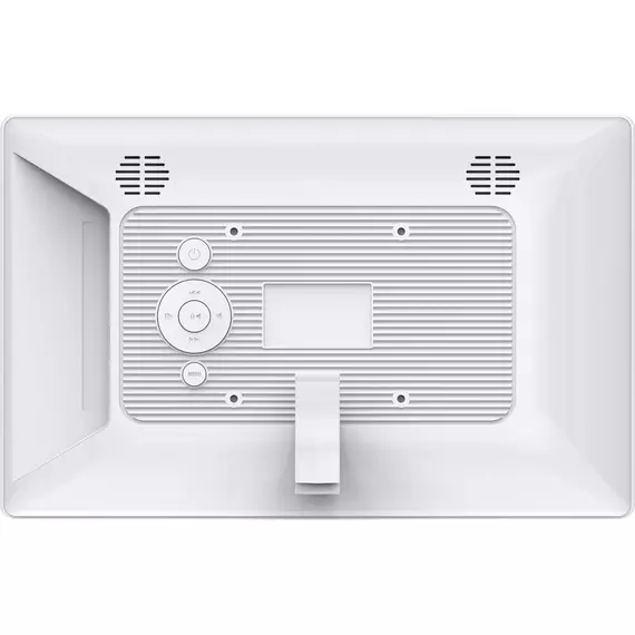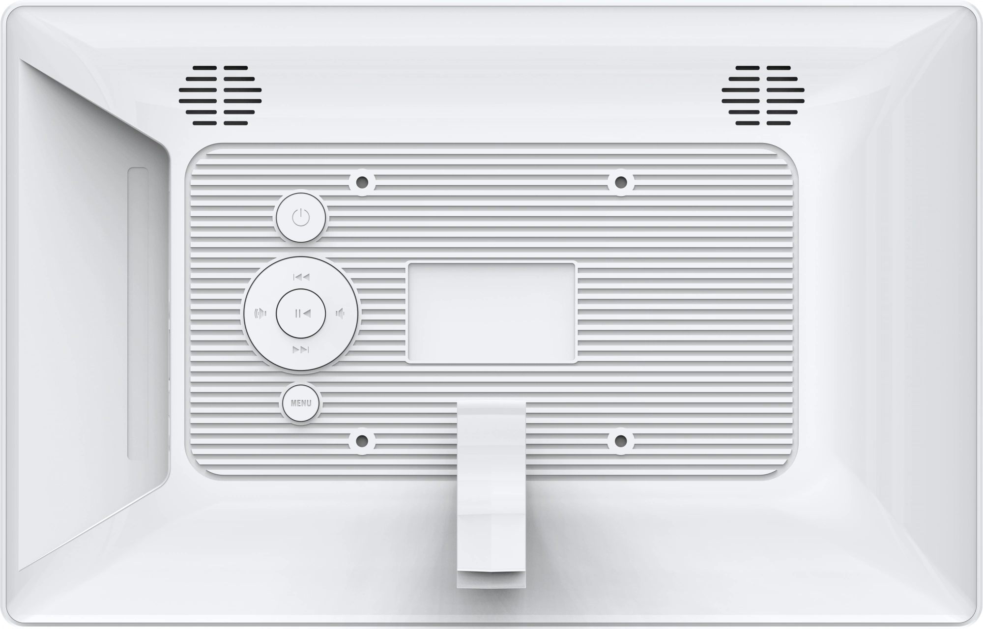 Фоторамка оснащена двумя динамиками для качественного звучания. Поддерживает карты памяти формата SD, SDHC и MMC. Кнопки управления расположены на задней панели, при этом к комплекту прилагается пульт ДУ. Есть разъём для наушников, чтобы полностью погрузиться в воспоминания.