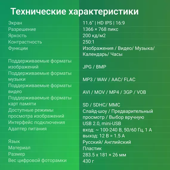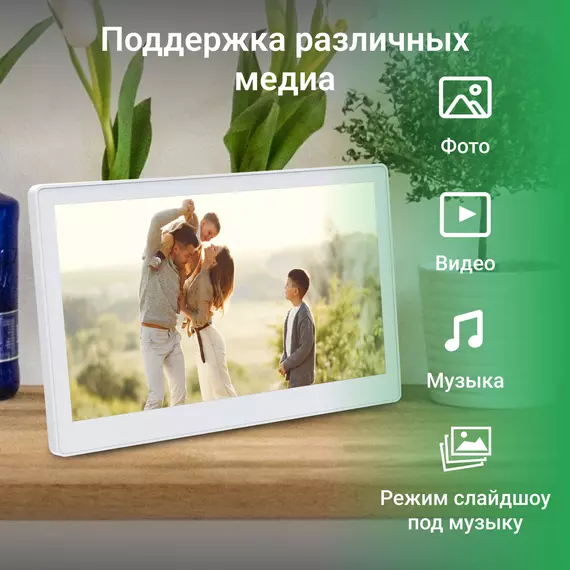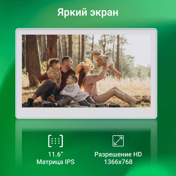 С IPS дисплеем и форматом экрана 16:9, фоторамка создаёт четкое и красочное изображение на диагонали 11.6 дюймов. Модель имеет HD-разрешение – 1366x768 пикселей. Пользователь самостоятельно регулирует яркость, контраст и насыщенность, чтобы каждый снимок выглядел идеально.
