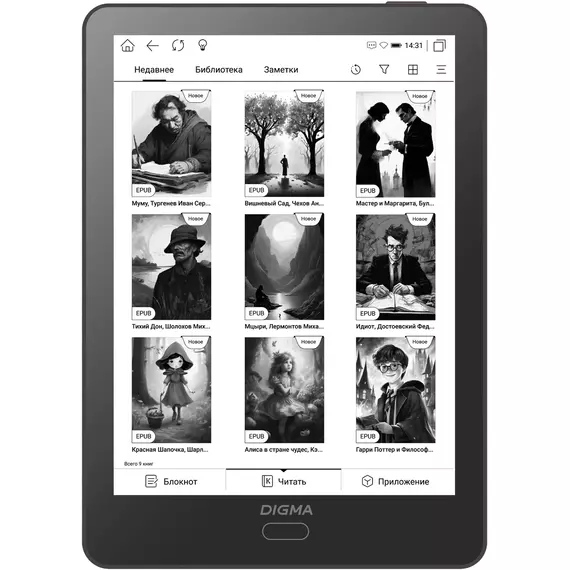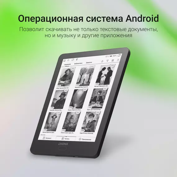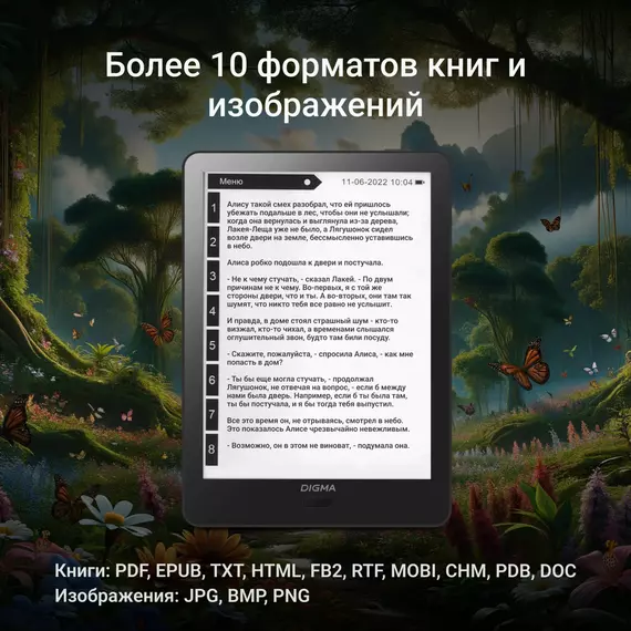 | Подержка форматов книг | EPUB, PDF, MOBI, DJVU, FB2, DOC, DOCX, HTML, RTF, TXT, CHM |