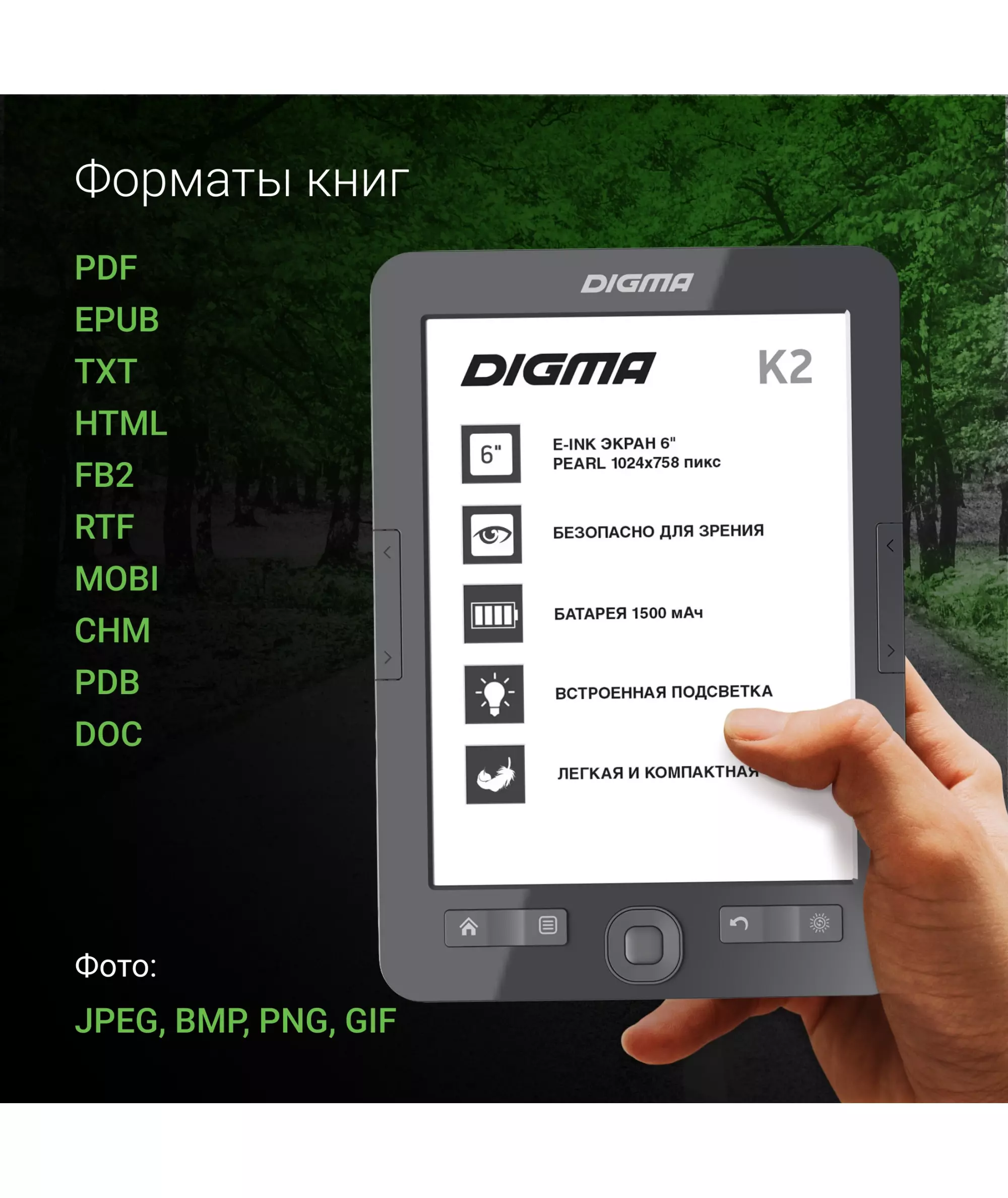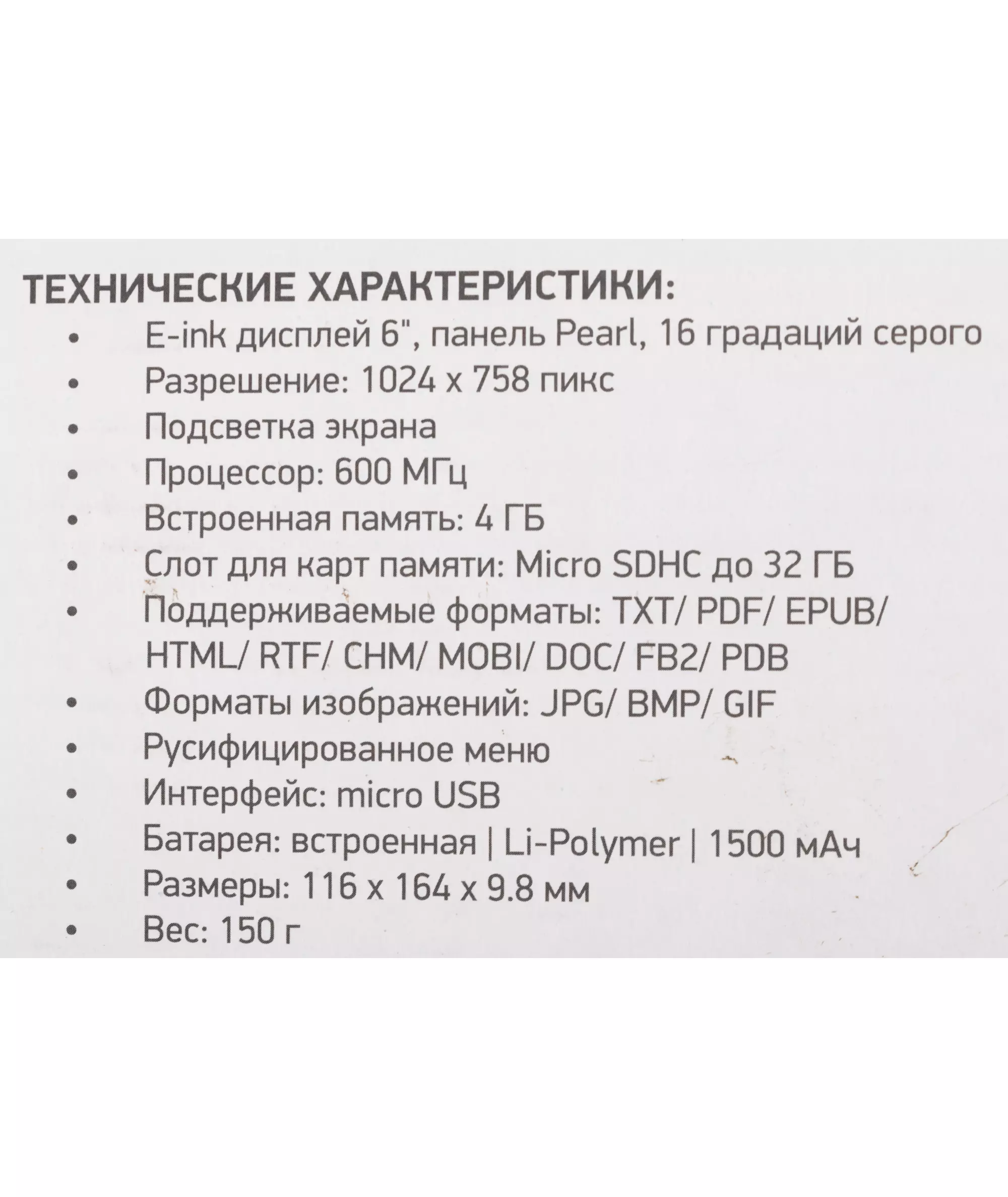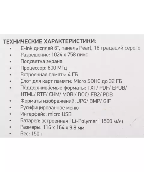 | Подержка форматов книг | PDF, EPUB, TXT, HTML, FB2, RTF, MOBI, CHM, PDB, DOC |