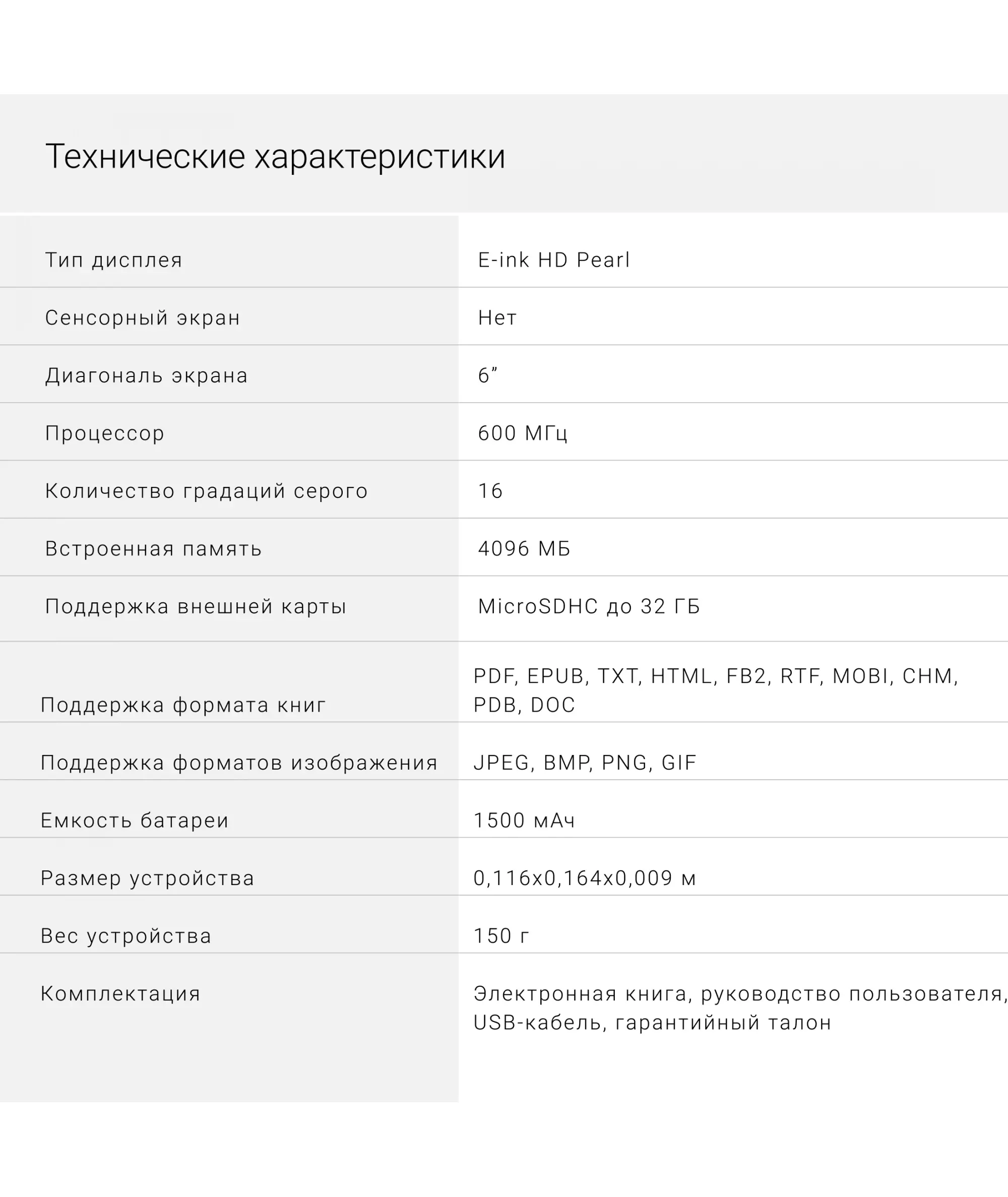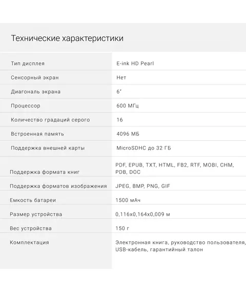 | Тип дисплея | E-ink HD Pearl |