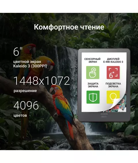 Электронная книга Digma P6B с 6-дюймовым экраном E-Ink Kaleido 3, оснащенная сенсорным дисплеем с разрешением 1072x1448, процессором с частотой 1.8 ГГц, а также памятью 3/32 ГБ. Устройство поддерживает карты SD/microSDHC. Цвет корпуса — темно-серый.