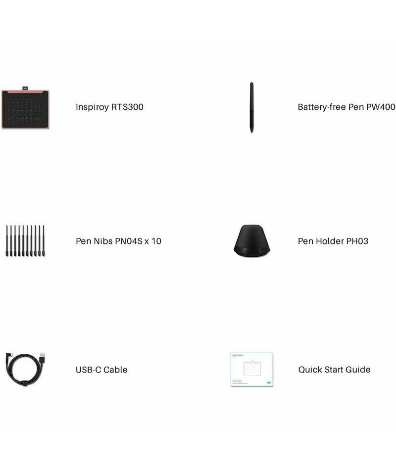 - Подробная комплектация: графический планшет, перо, переходник USB - USB Type-C, наконечники – 8 шт, подставка, кабель USB – USB Type-C, руководство пользователя