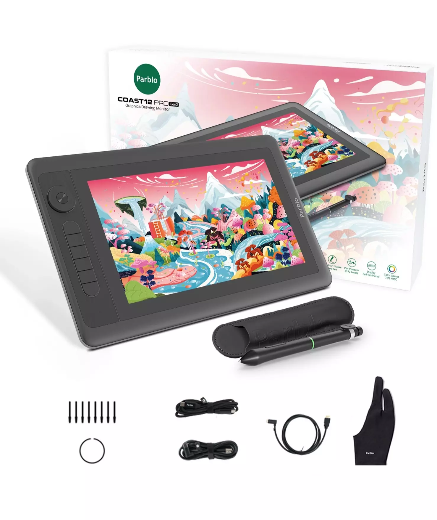 Графический монитор Parblo Coast 12 Pro Gen 2 (11.6 дюймов) имеет чувствительность пера 8192 уровня, разрешение 1920x1080, шесть настраиваемых клавиш и колесо прокрутки. Цветовое пространство 72% NTSC (100% sRGB). Пассивное перо S01 поддерживает наклон до 60 градусов. Совместим с Windows и Mac OS.