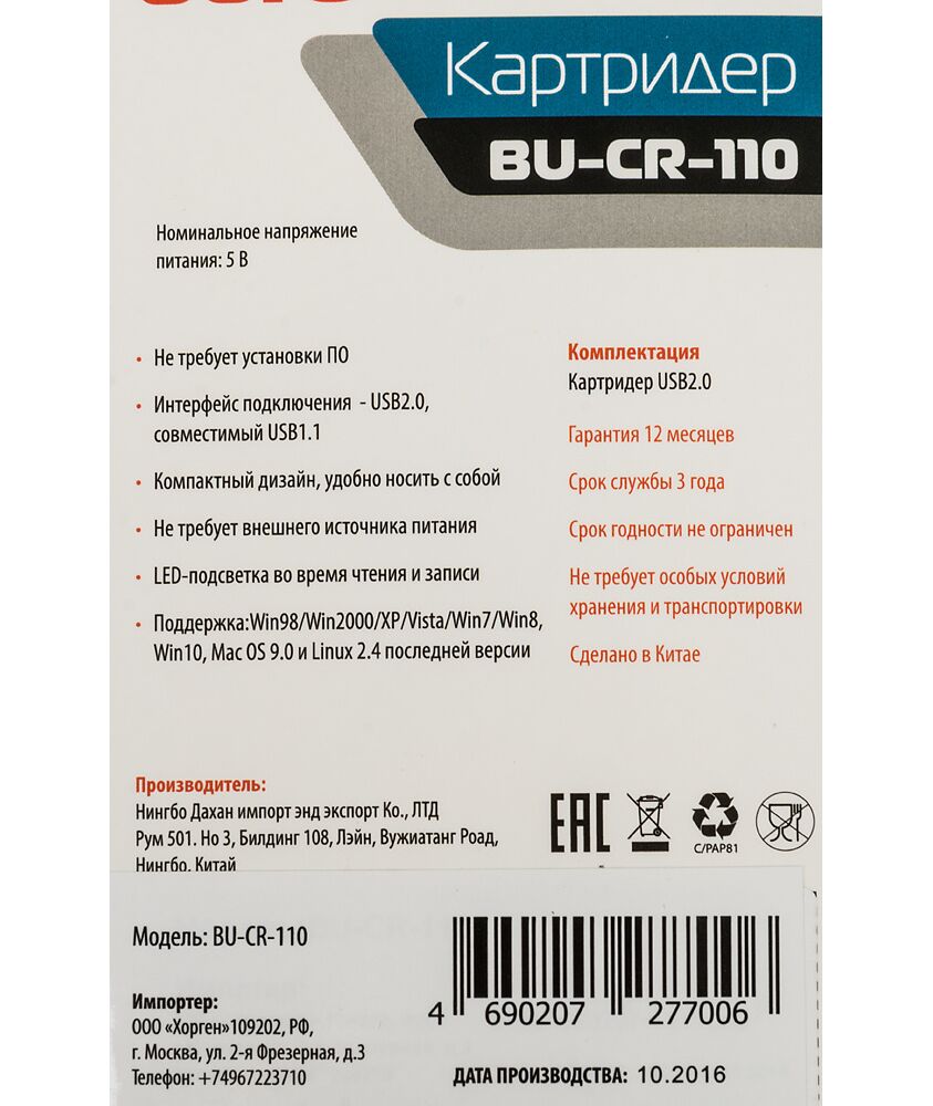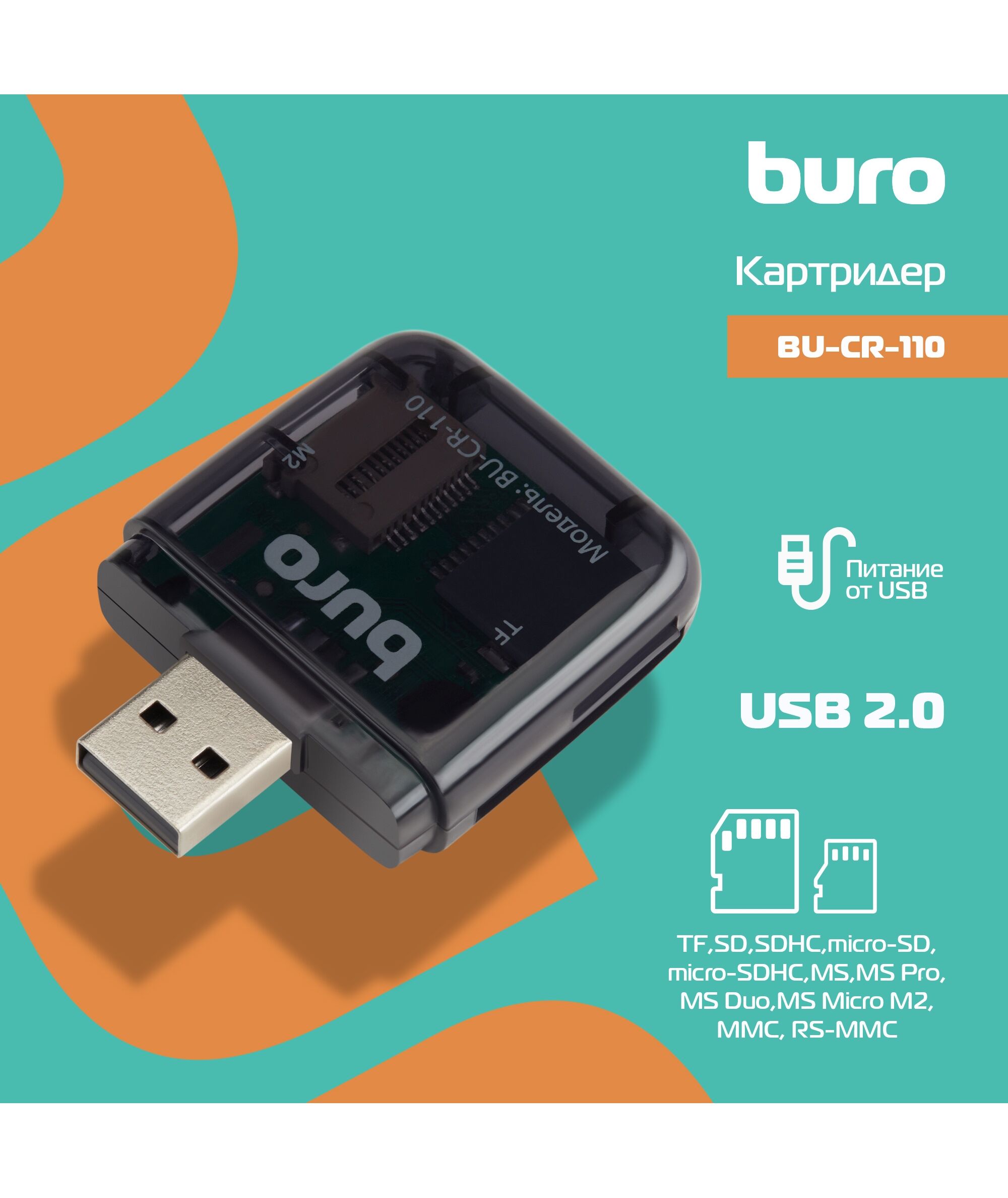 Устройство чтения карт памяти BURO BU-CR-110 USB2.0 черный