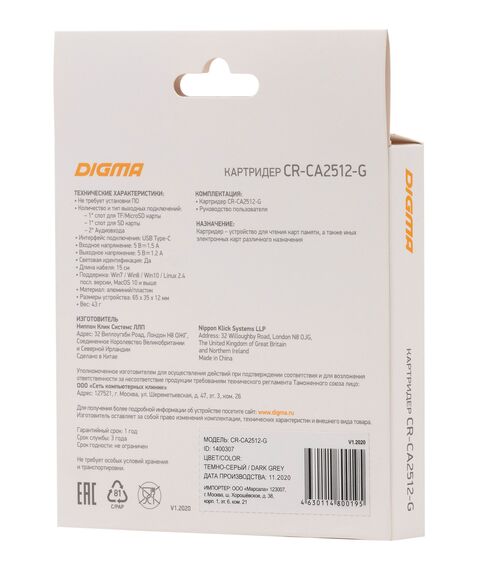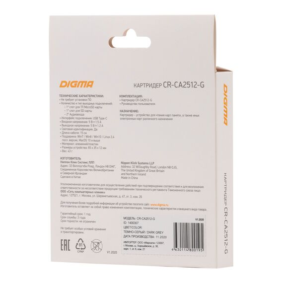 Устройство чтения карт памяти Digma CR-СA2512-G USB Type-C серый