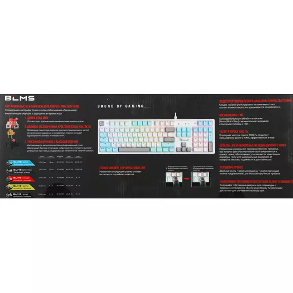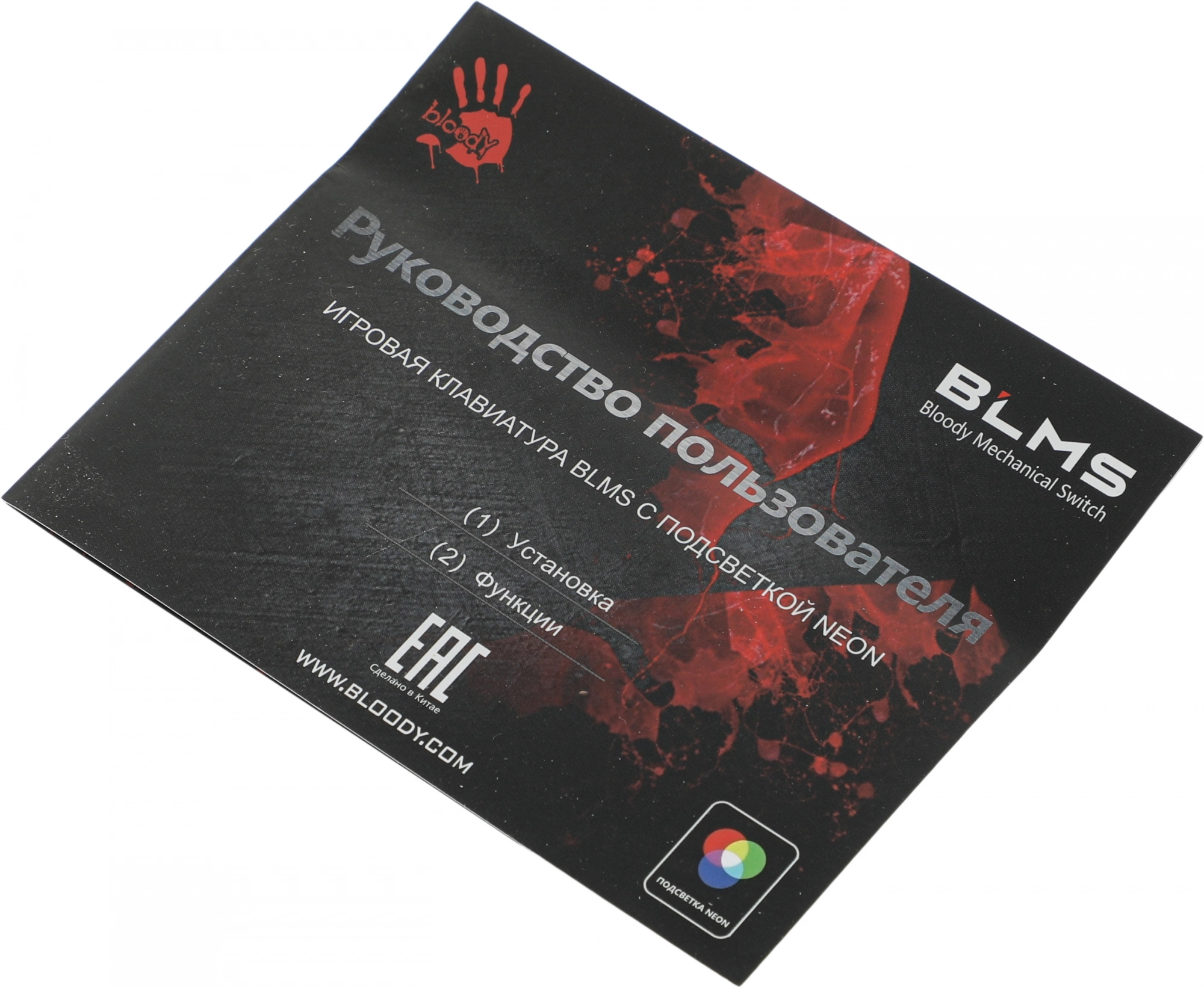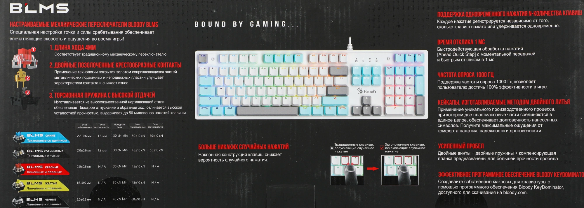 | Особенности | Новые механические свитчи Bloody Mechanical Switches. Мультимедийные горячие клавиши: есть, 12 (FN+). Подсветка может быть перепрограмирована до RGB (скачать фирменное ПО с офиц сайта bloody) |