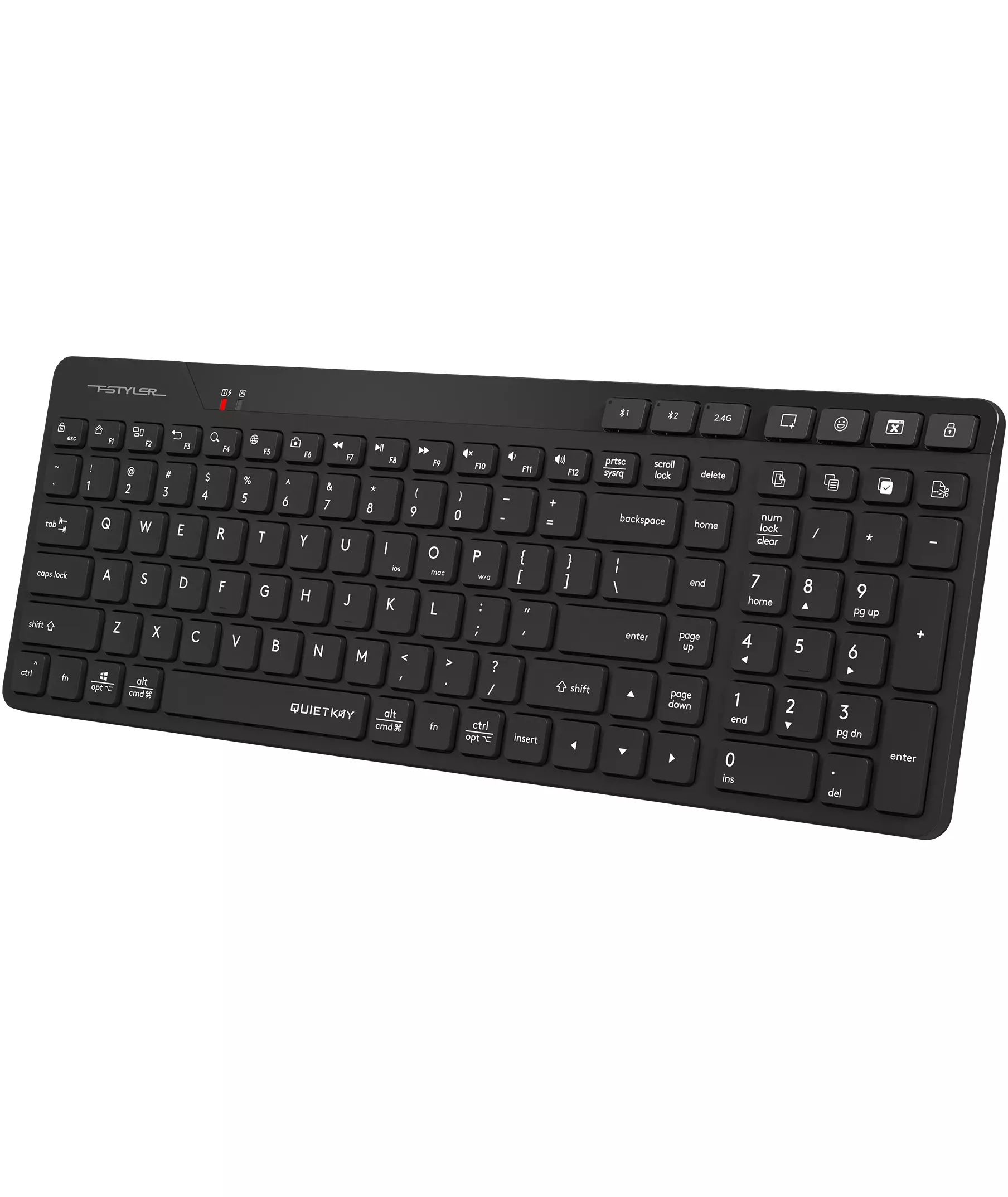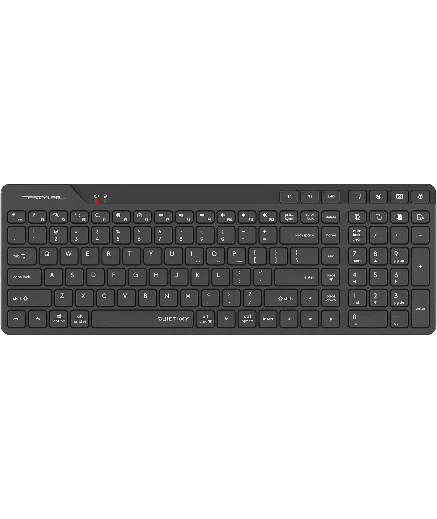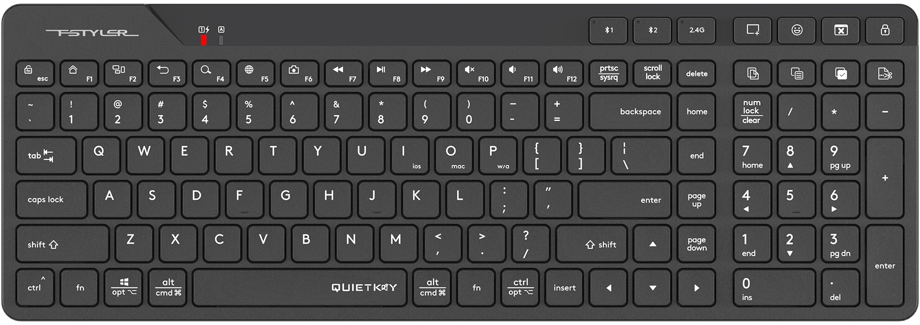 | Особенности | A4Tech/Fstyler Bluetooth и перезаряжаемая клавиатура 2,4G. Режим двойного подключения (BT+ 2,4 ГГц). Сопряжение до 3 устройств (BTx2, 2.4Gx1). Расположение входов, совместимое с Mac/ПК/iOS/Android |
