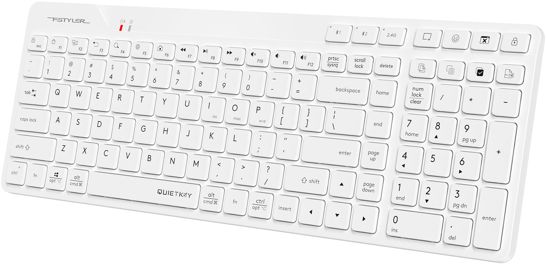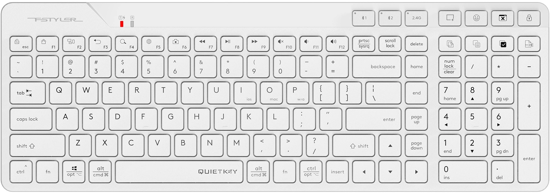 | Особенности | A4Tech/Fstyler Bluetooth и перезаряжаемая клавиатура 2,4G. Режим двойного подключения (BT+ 2,4 ГГц). Сопряжение до 3 устройств (BTx2, 2.4Gx1). Расположение входов, совместимое с Mac/ПК/iOS/Android |