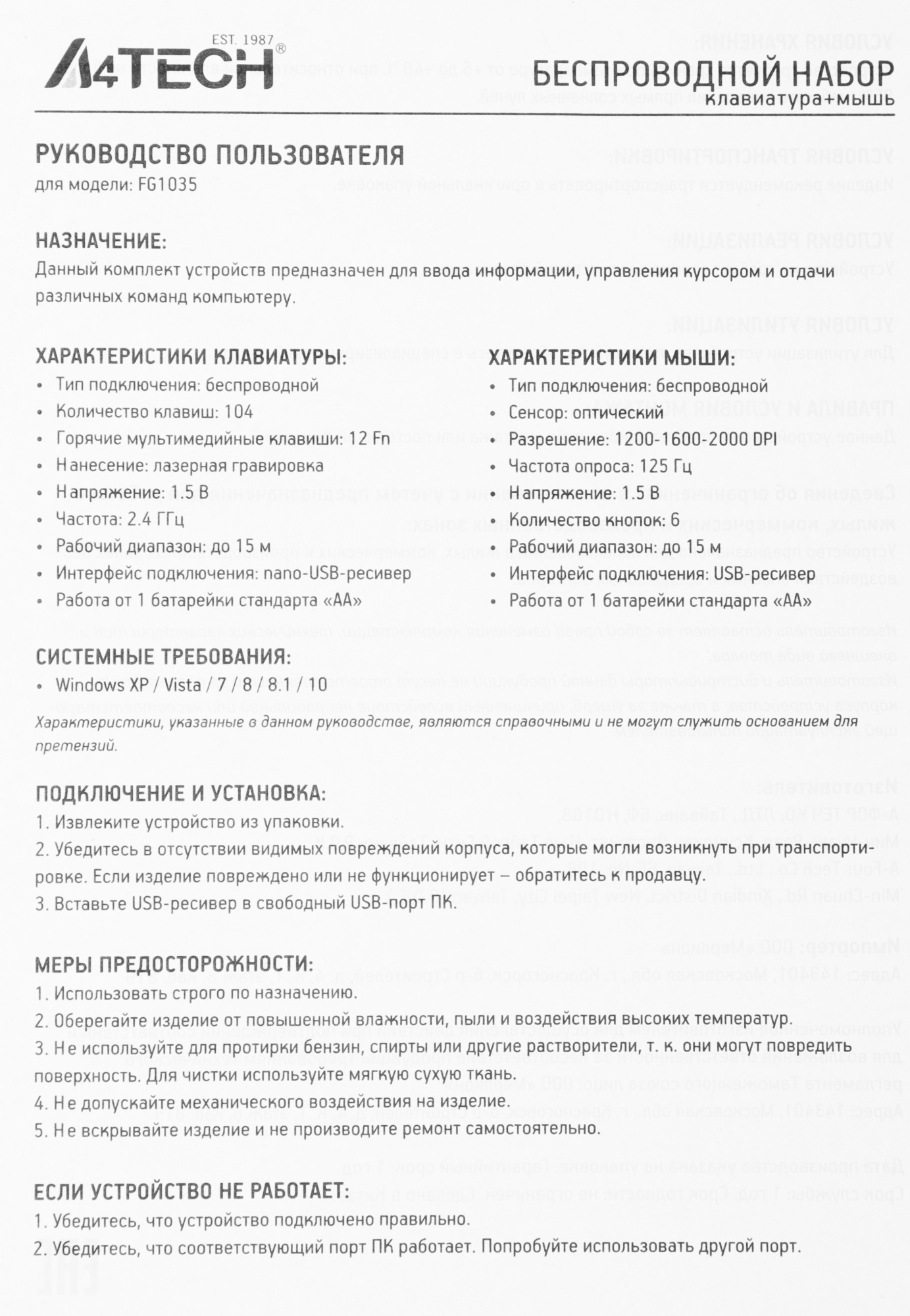 | Питание клавиатуры | 1xAA |